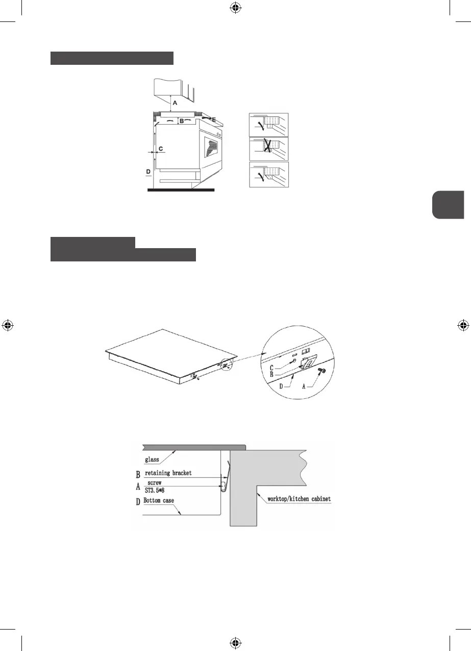 Fix the hob on the work surface by screw four brackets on the bottom of hob (see picture)