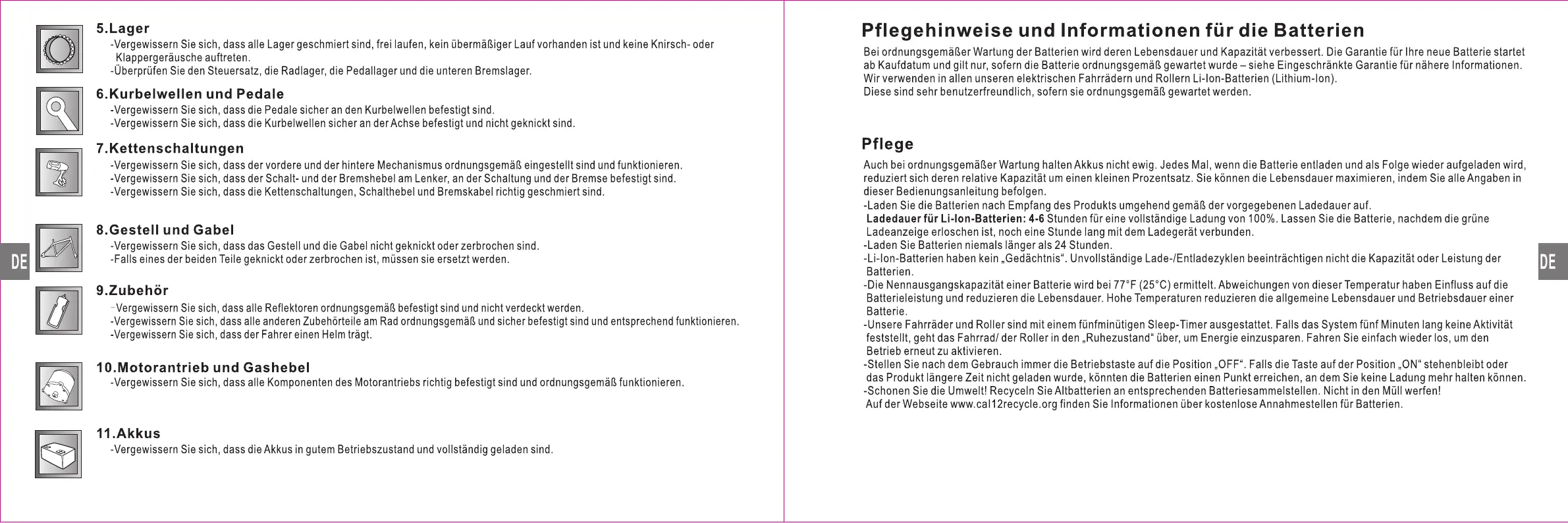MPMan EB8 - Battery Care and Information; Bearings; Cranks and Pedals; Derailleurs