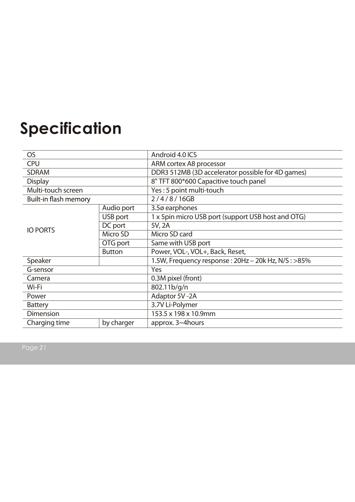 1.5W, Frequency response : 20Hz 20k Hz, N/S : >85%