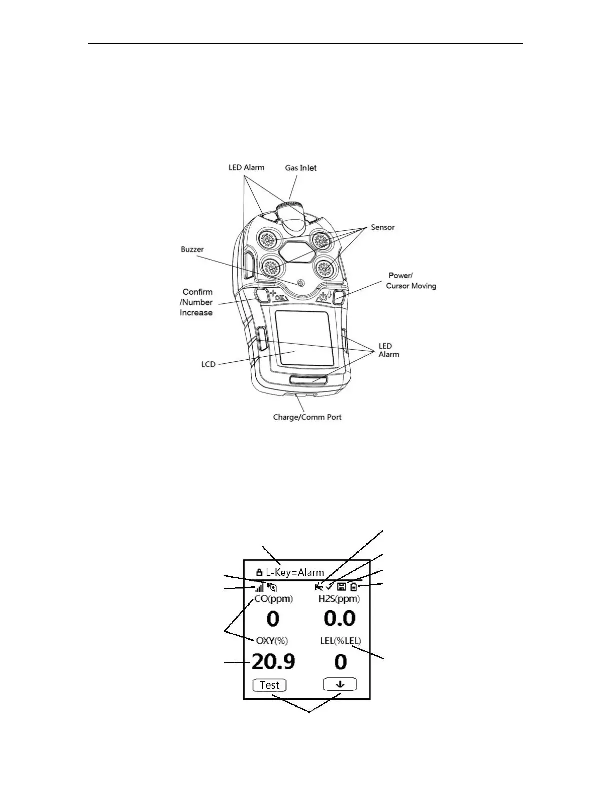 The LCD provides visual information that includes real-time gas readings, sensor types,