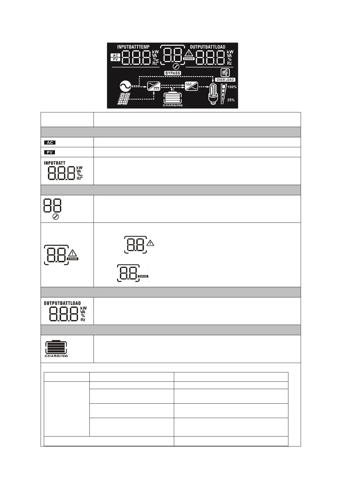 Indicate input voltage, input frequency, PV voltage, charger current (if PV in