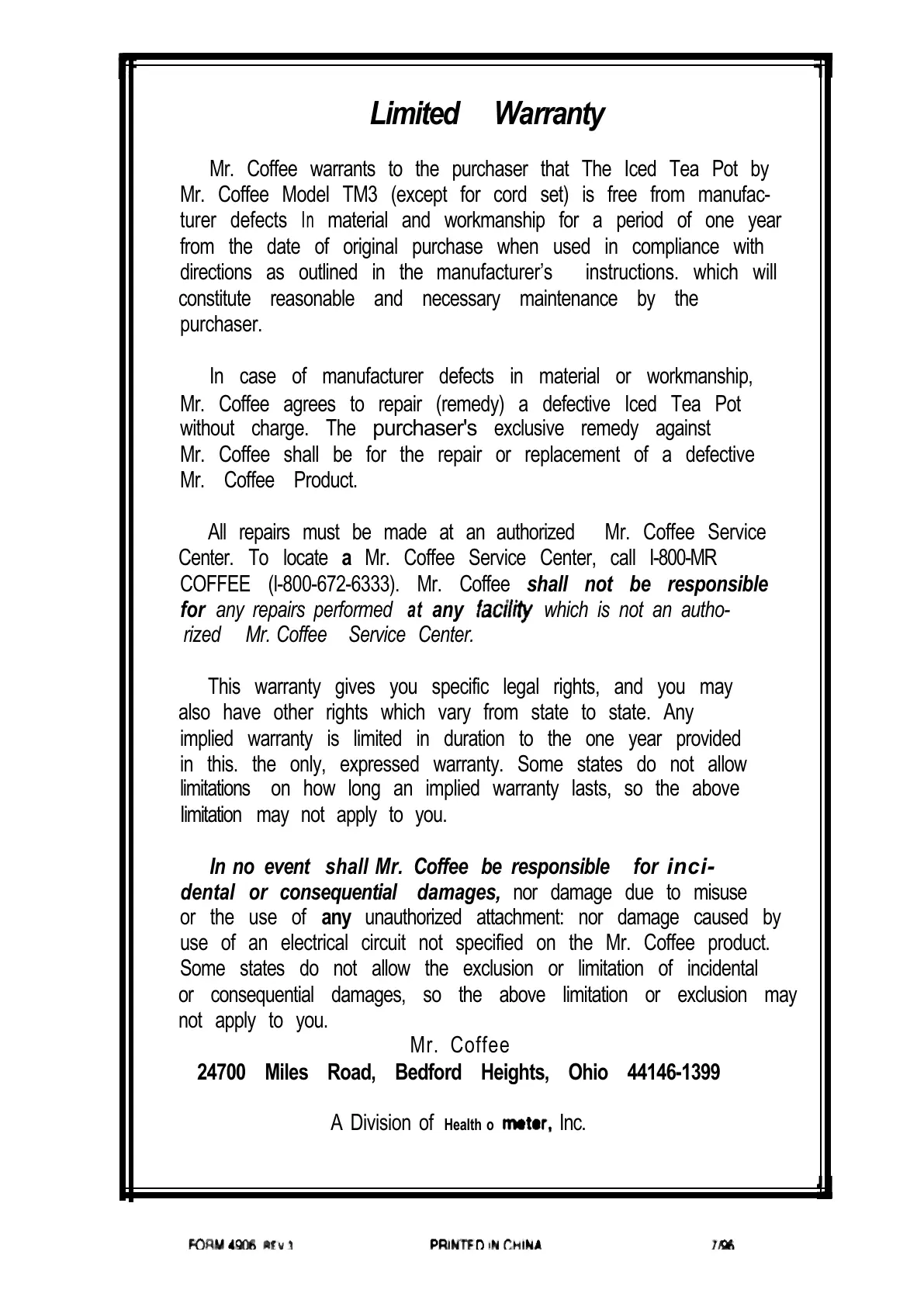 Mr. Coffee warrants to the purchaser that The Iced Tea Pot by