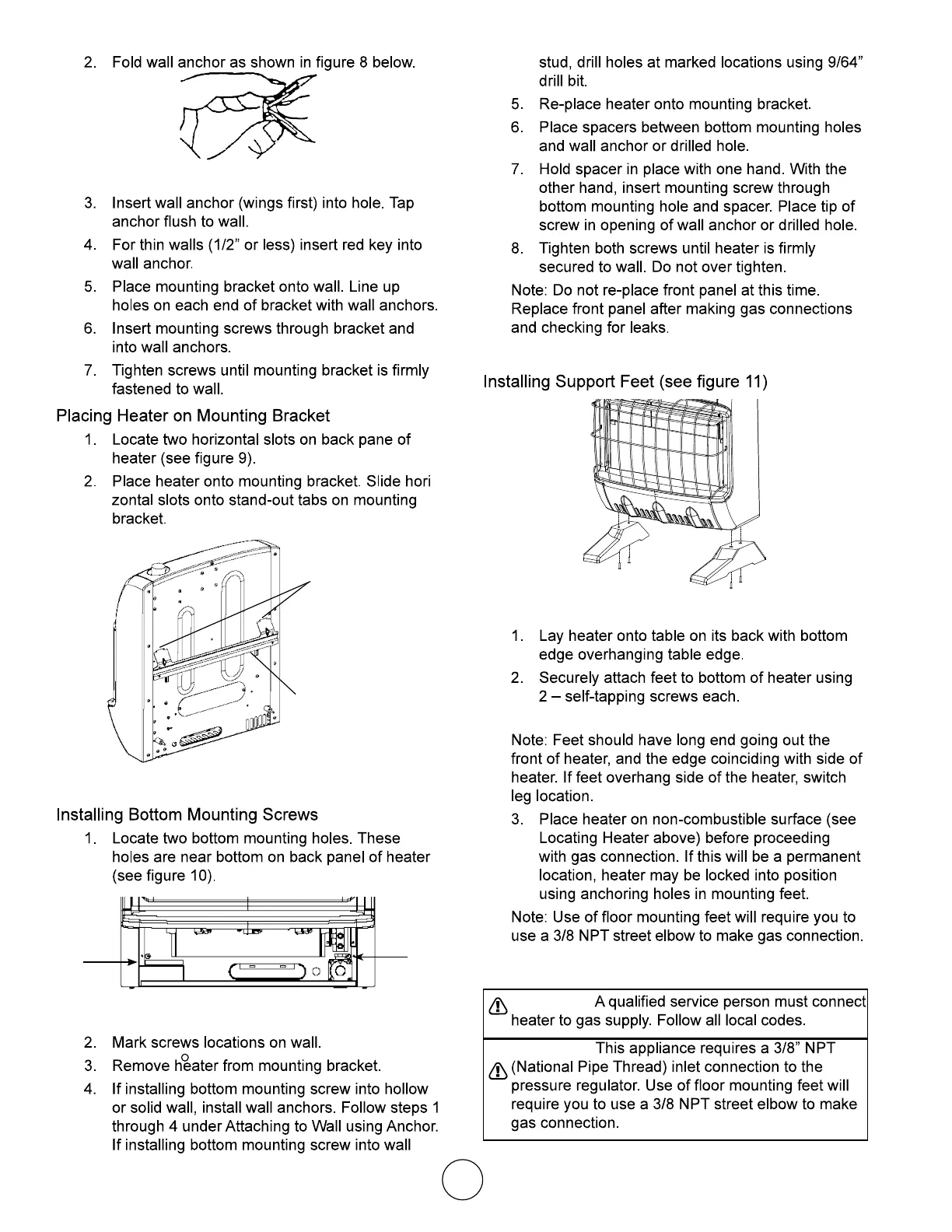 Mr. Heater MHVFGH30LPBT - Heater Installation and Connections; Attaching to Wall Anchors (Continued); Gas Supply Connection Warning