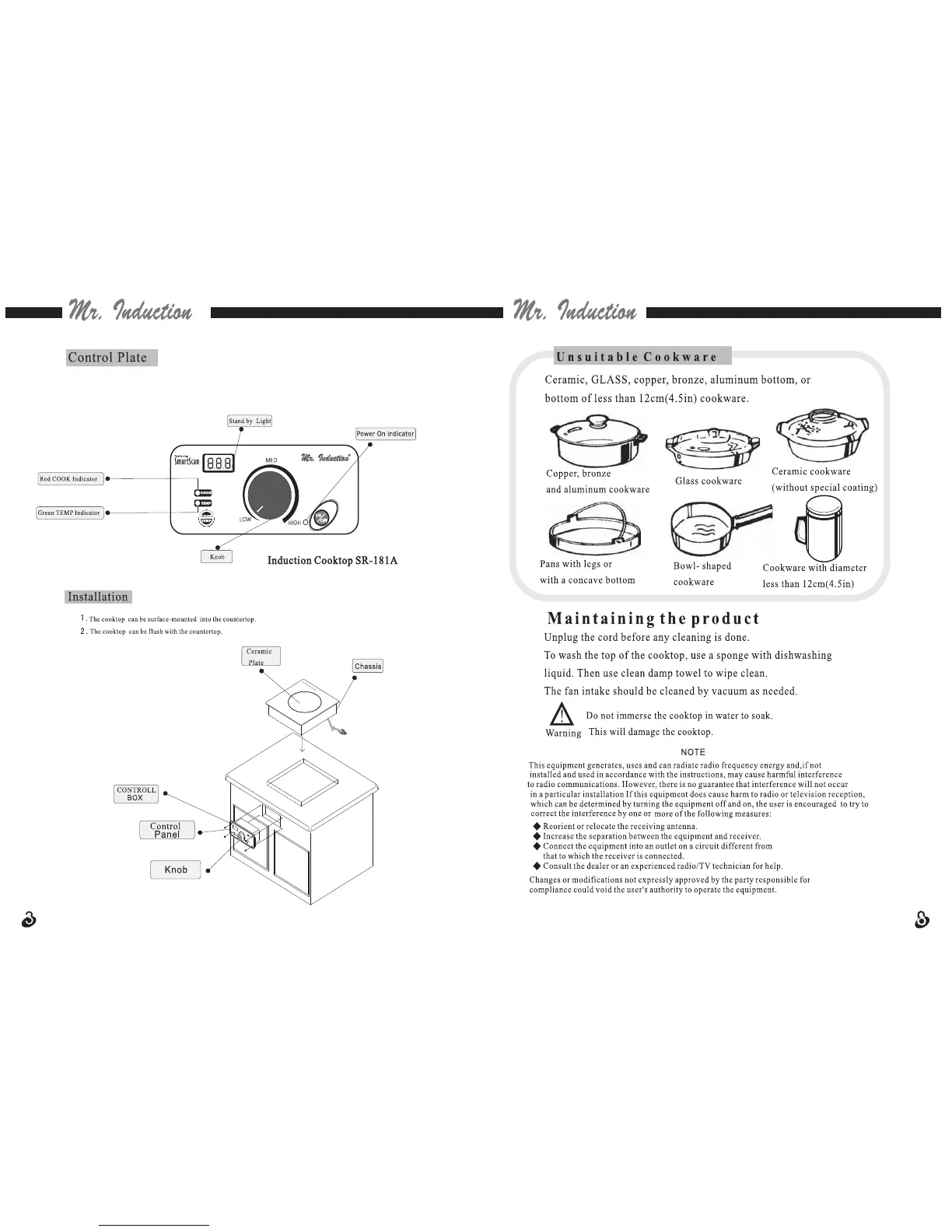 Mr. Induction Smartscan SR-181R - Control Plate Overview; Maintaining the Product; Cleaning and Maintenance; Installation