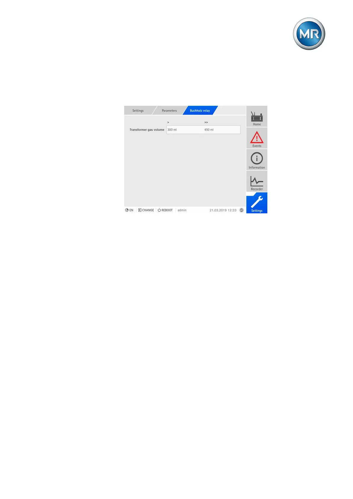 1. Go to Settings > Parameters > Active part > Buchholz relay.