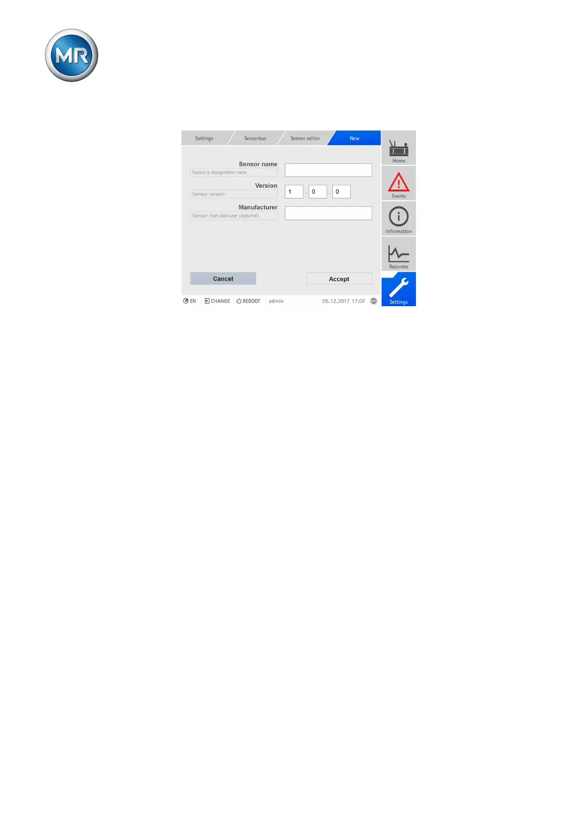 3. Enter the sensor name, sensor version and sensor manufacturer (op-