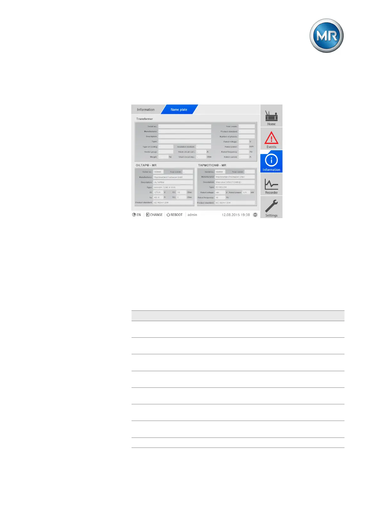 You can display the name plate data for the transformer, on-load tap-