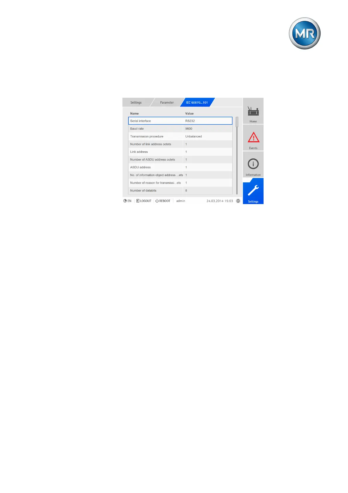 1. Go to Settings > Parameters > IEC 60870-5-101 > Serial interface.