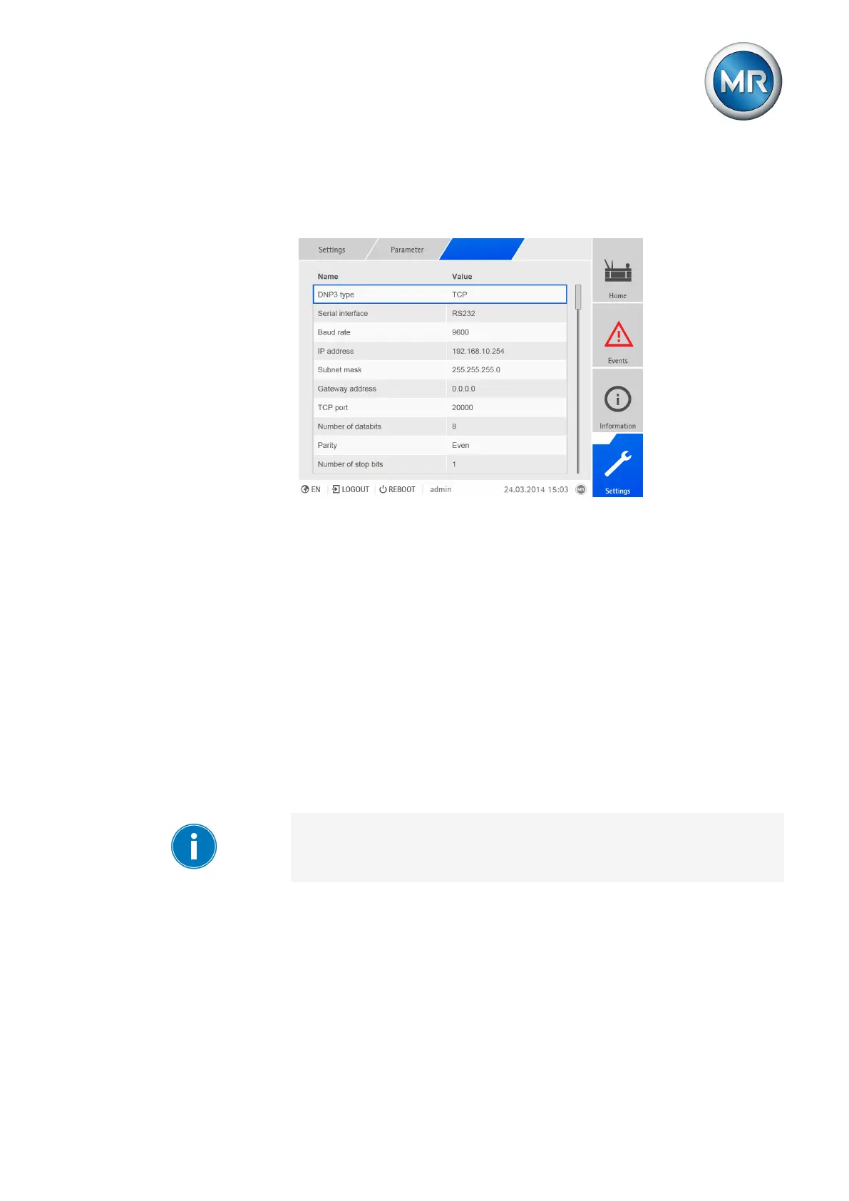 1. Go to Settings > Parameters > DNP3 > IP address.