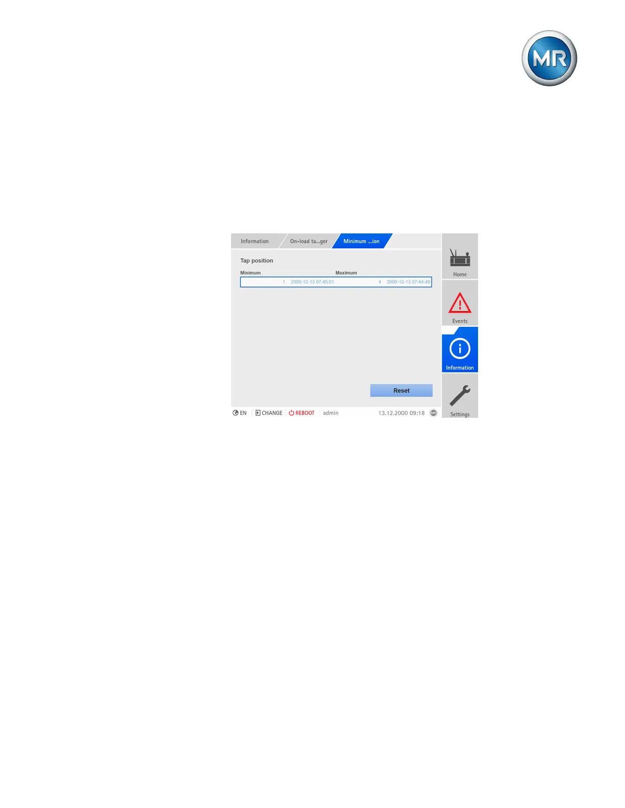 1. Go to Information > On-load tap-changer > Minimum and maximum