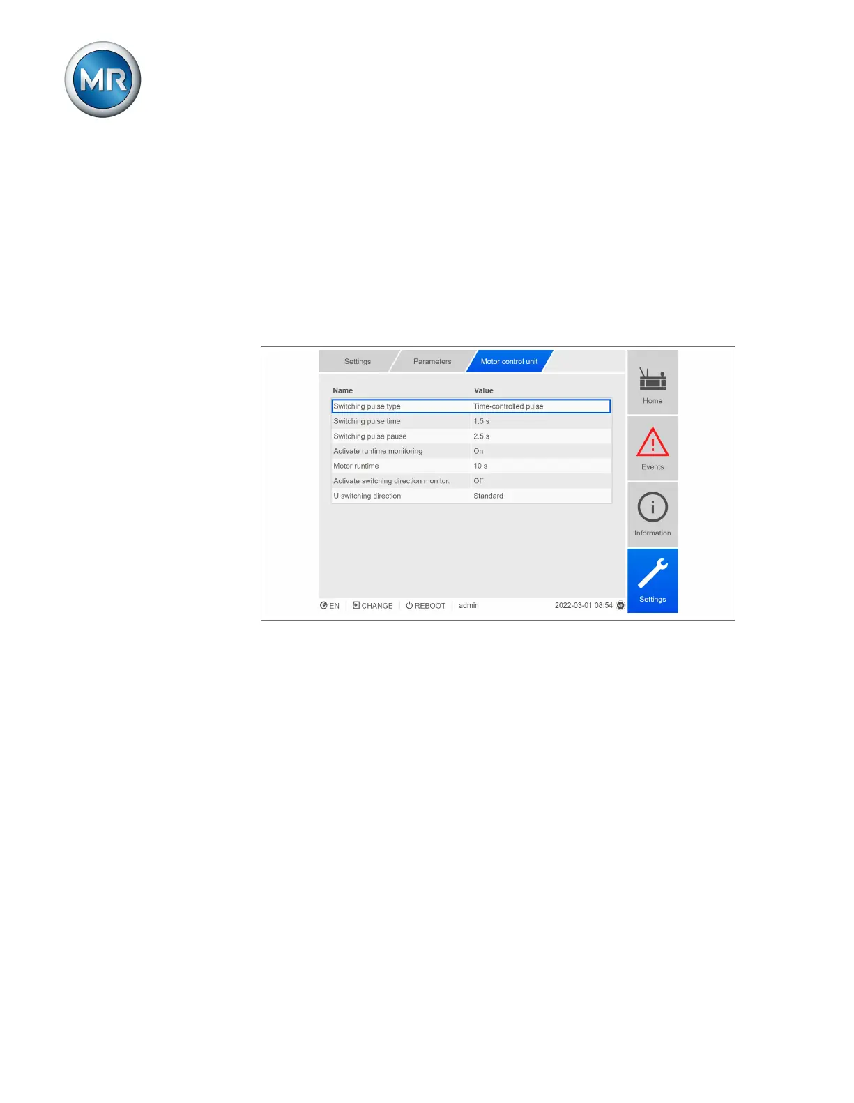 1. Go to Settings > Parameters > Motor and control cabinet > Motor