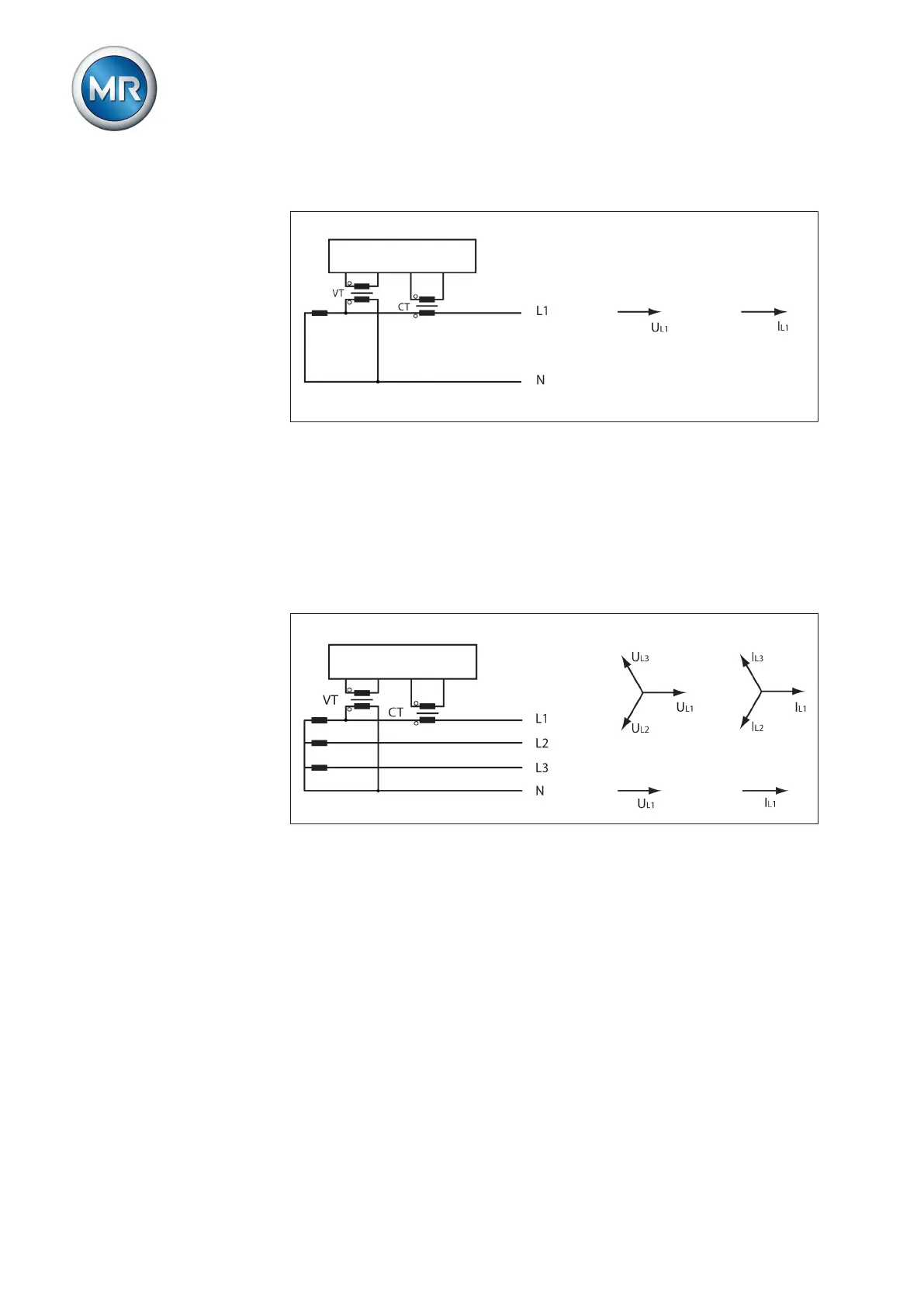 ▪ The voltage transformer VT is connected to the outer conductors L1 and