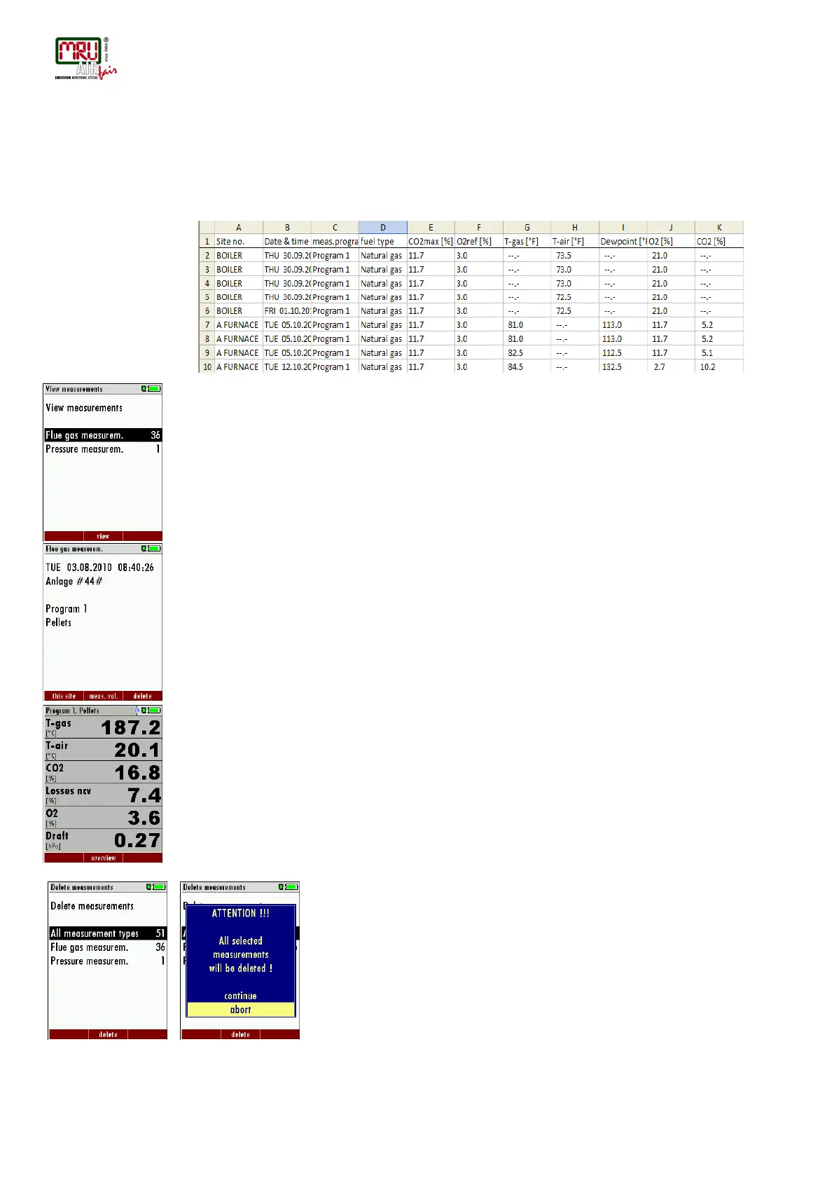 Measuring program name, Fuel type, CO2max, O2reference, and all measured values that the