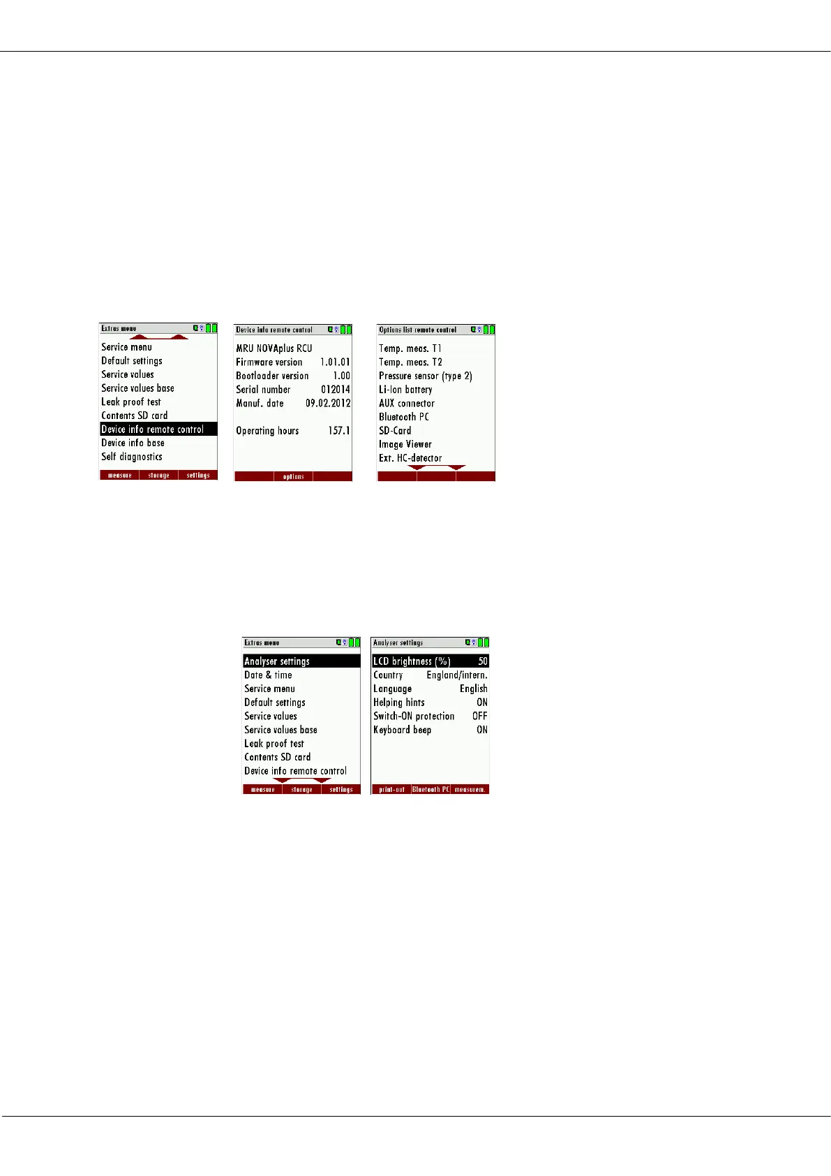 Switch on the analyzer then navigate to – Extras (F3) Analyzer info RCU /