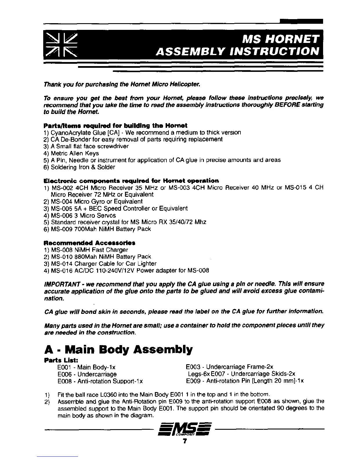 MS Composit Hornet - Assembly Instruction; Parts;Items Required; Electronic Components; Recommended Accessories