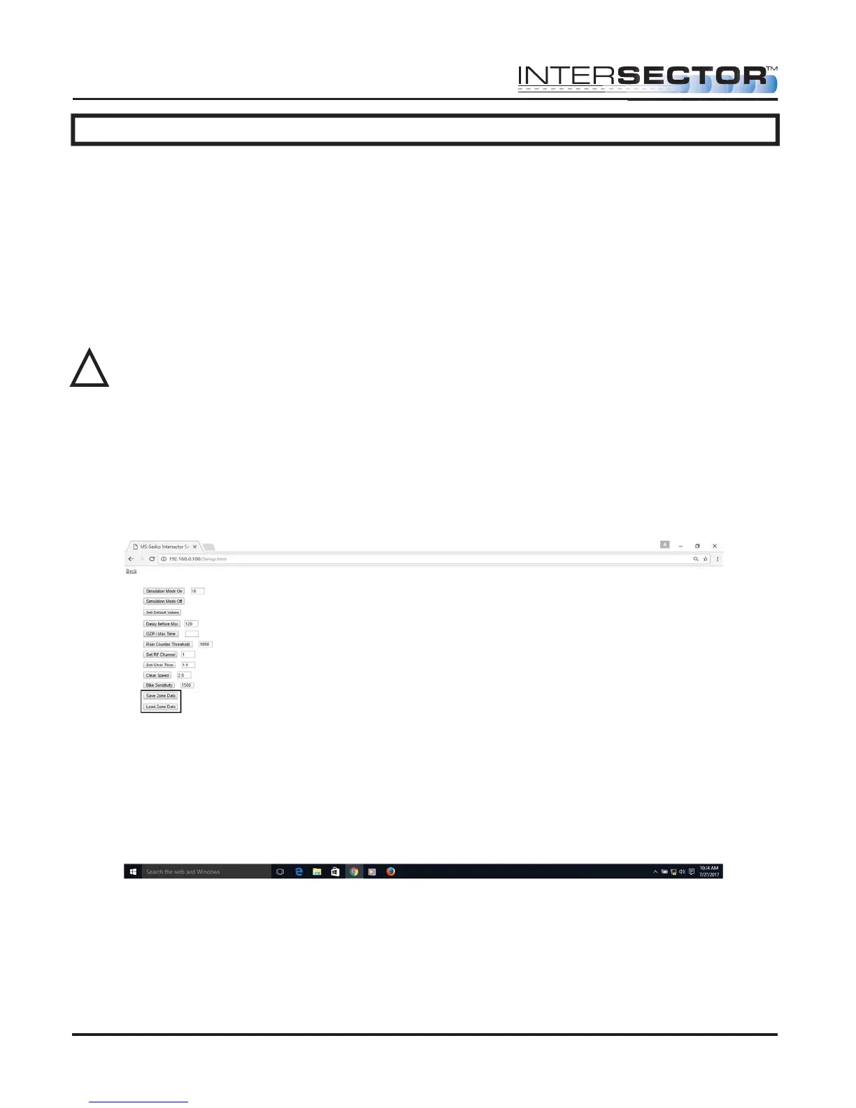INTERSECTOR setup and Zone setting data. When the Save Zone Data button is