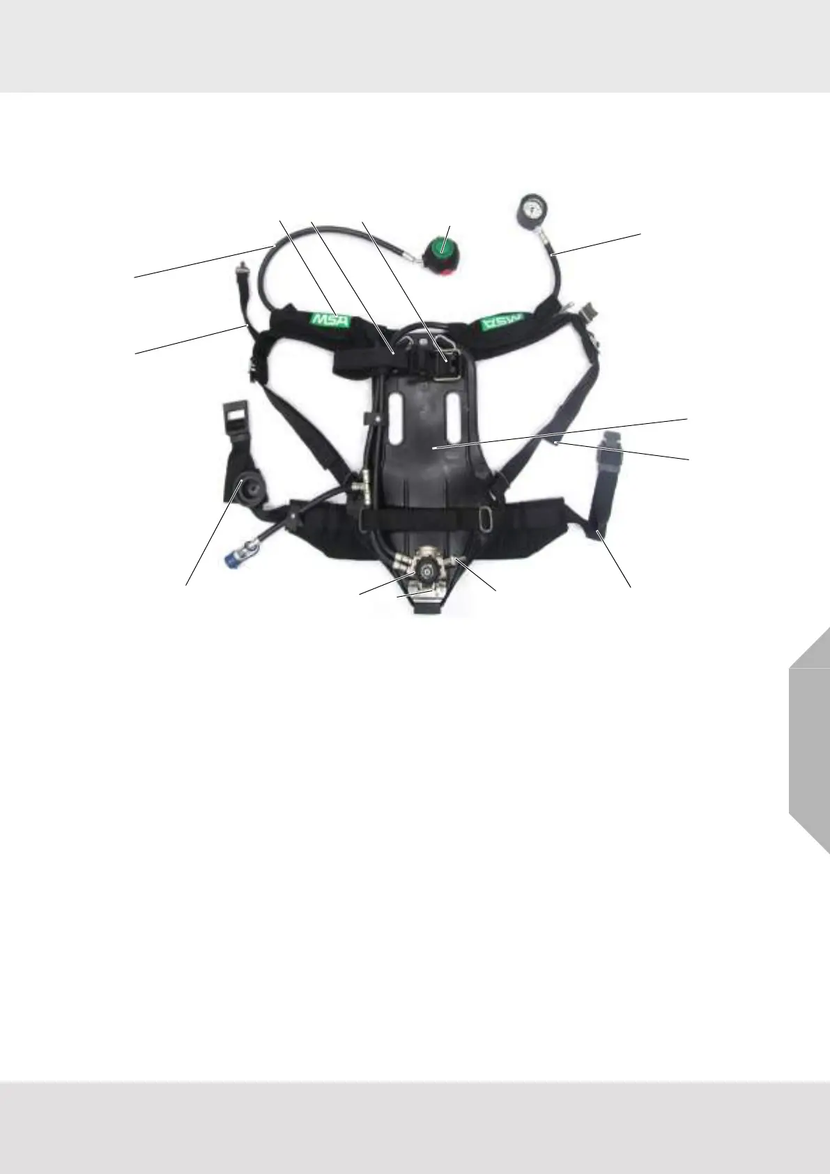 hose, pressure gauge and demand valve. Back plate is designed to use symmetrical plastic handles for convenient