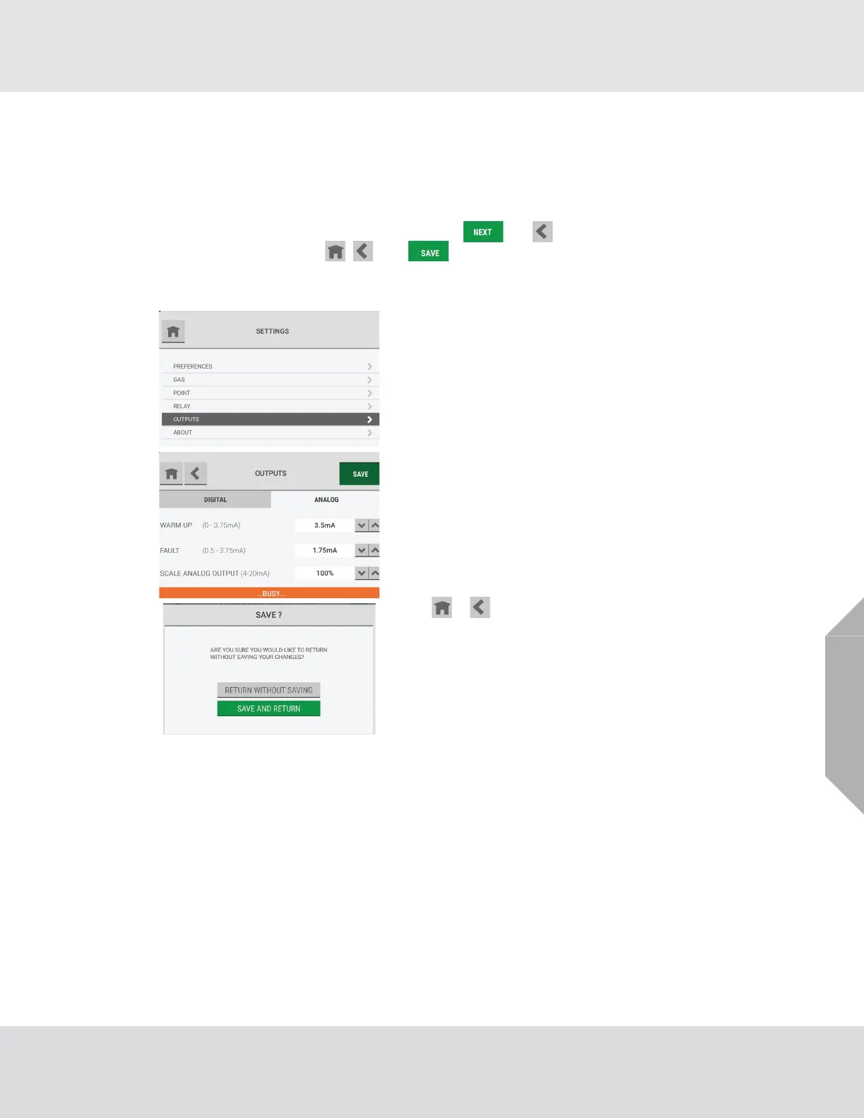 During the initial setup, the screen headers show the and buttons. During routine operation,