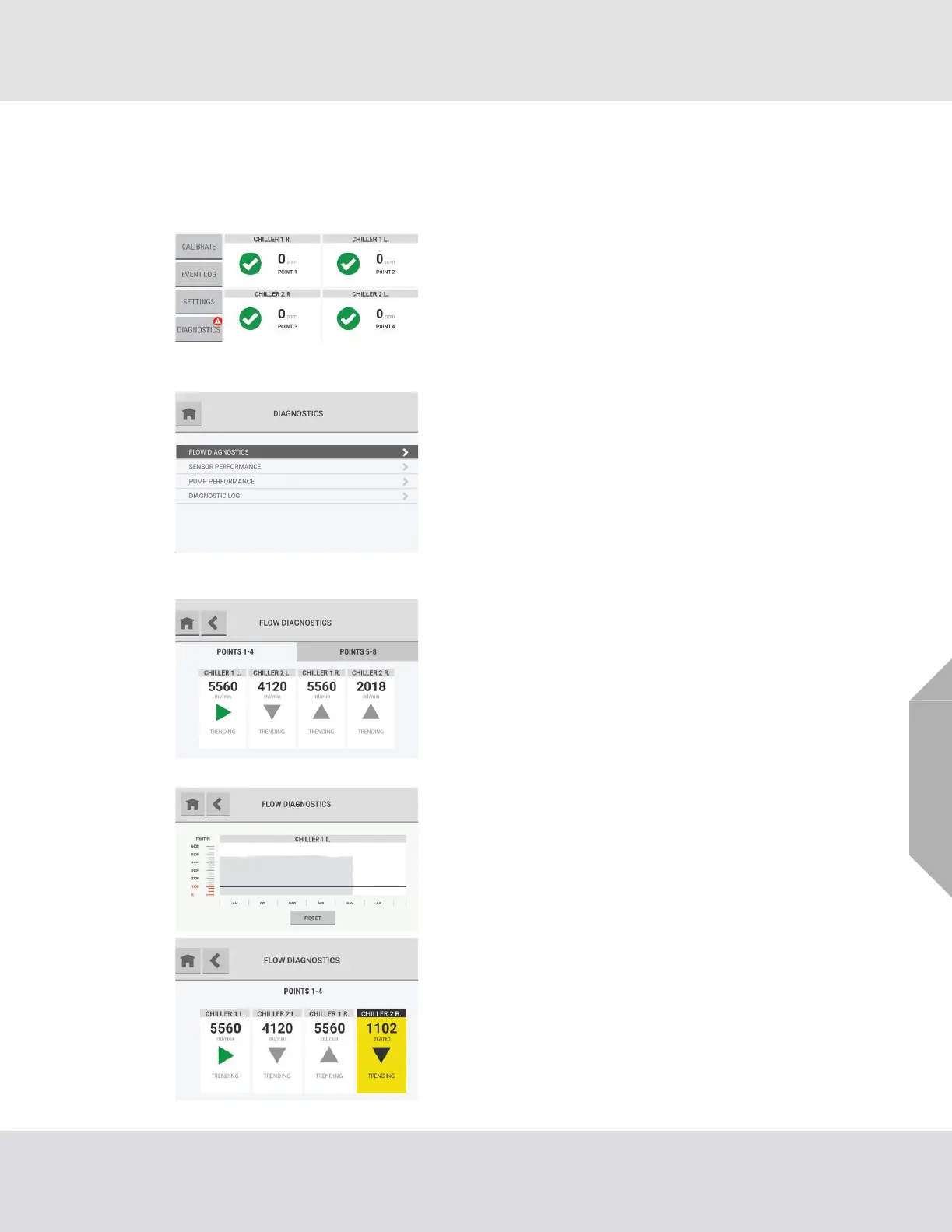 The "Flow Diagnostics" screen shows data for four points.