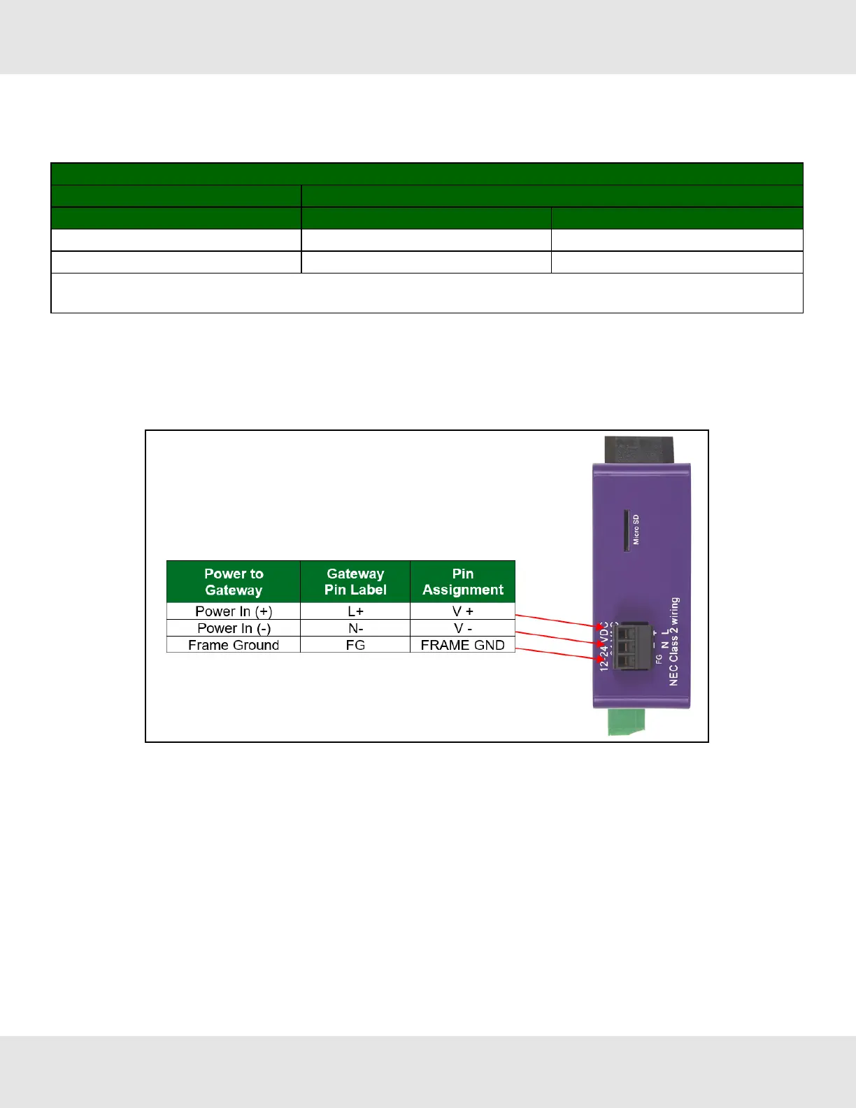 • The gateway accepts 9-30VDC or 24VAC on pins L+ and N-.