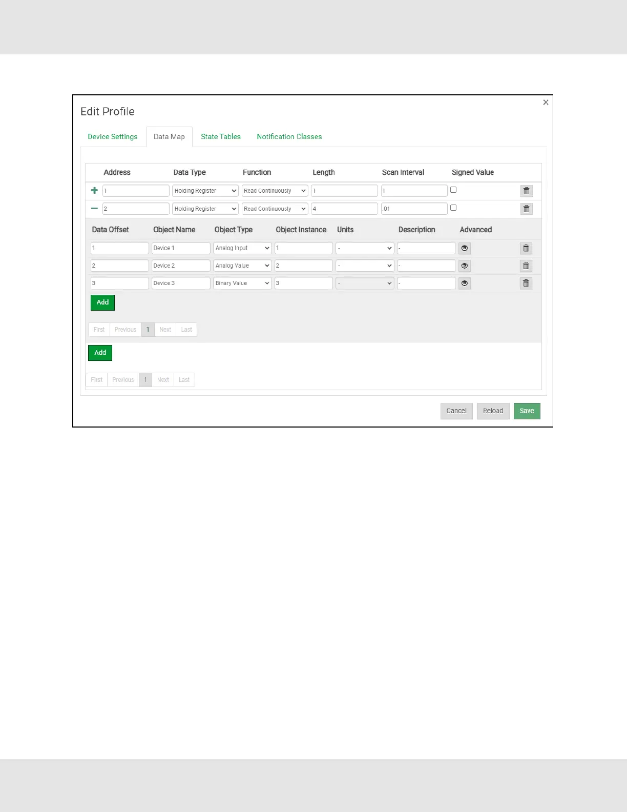 • Click on the blue plus sign icon on the left side of the Address to map the BACnet Addresses to the Modbus Registers.