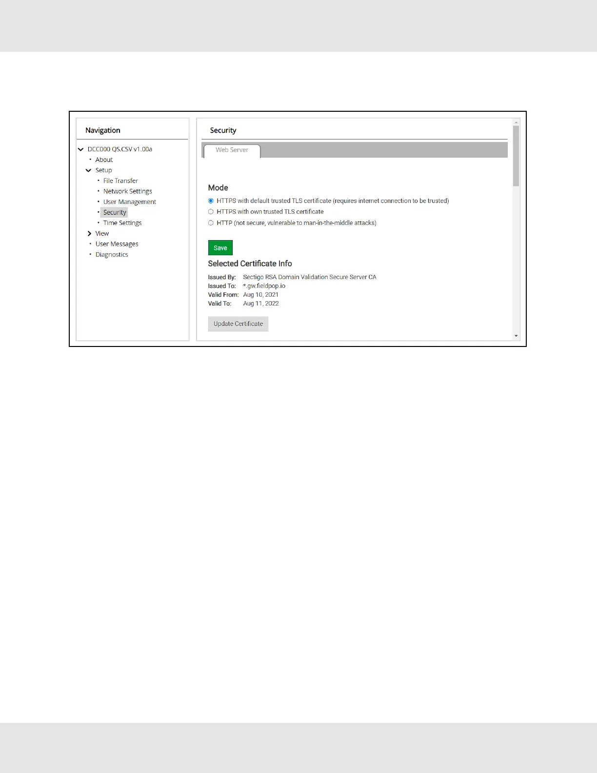 If HTTPS with own trusted TLS certificate is selected, follow instructions in Section 6.2.1 HTTPS with Own