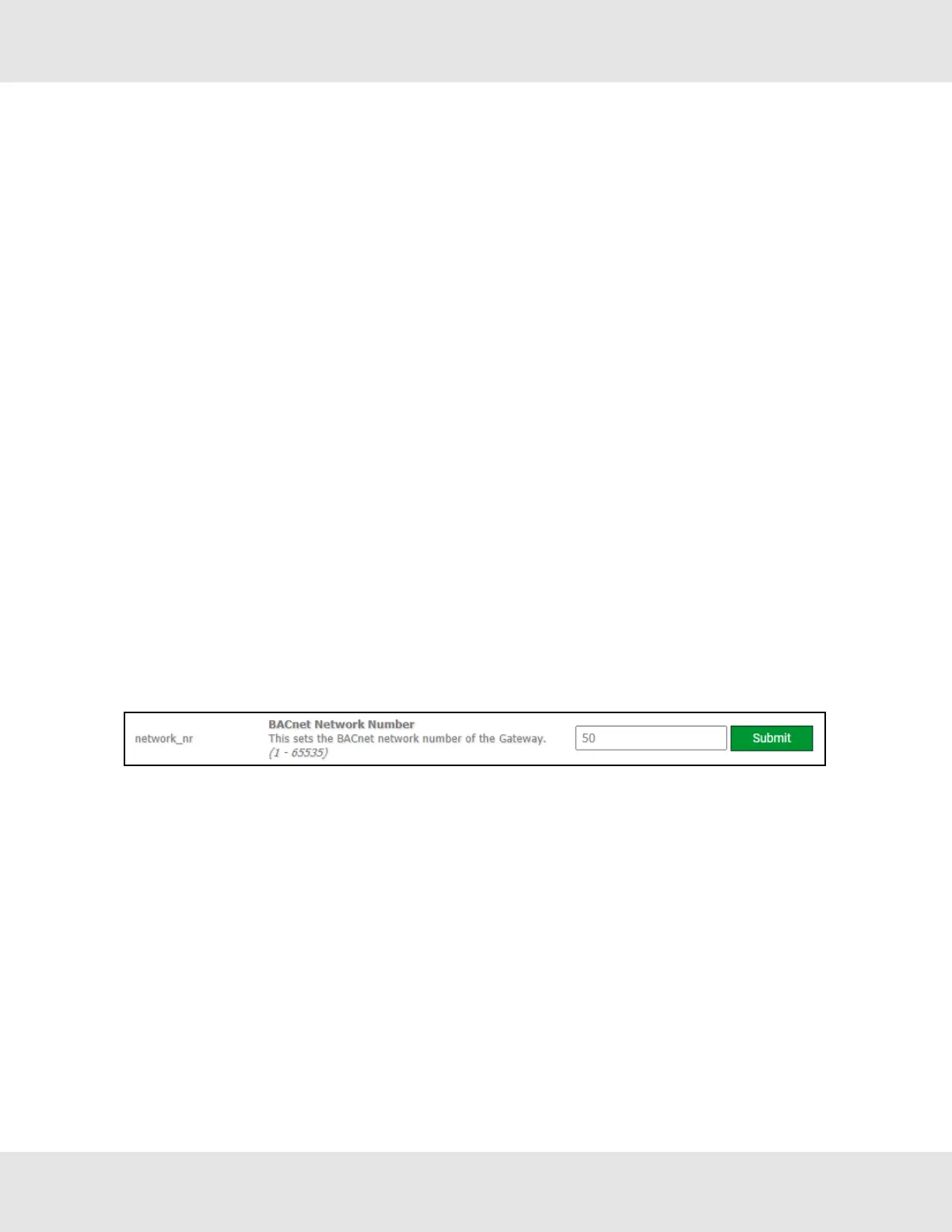 On the main Web Configuration screen, update the BACnet Network Number field and click submit. The default value is 50.