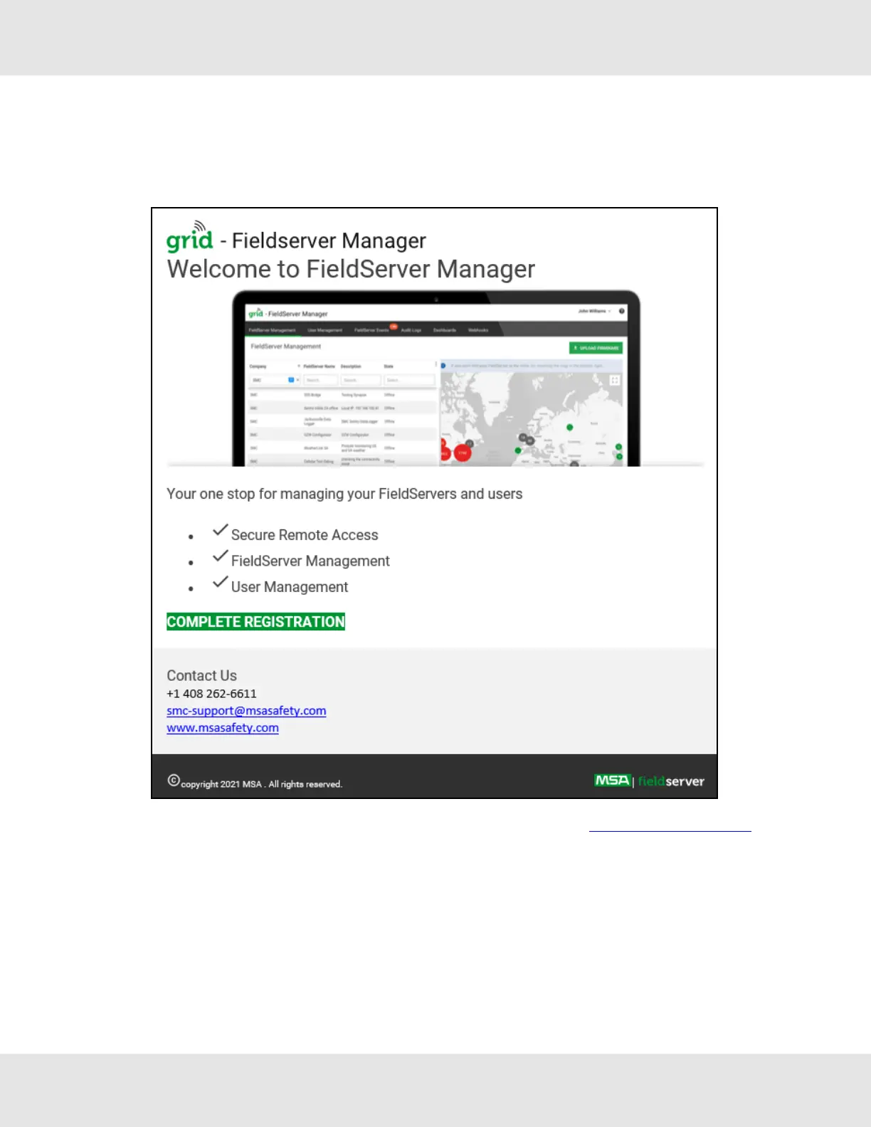 • The “Welcome to the MSA Grid - FieldServer Manager” email will appear as shown below.