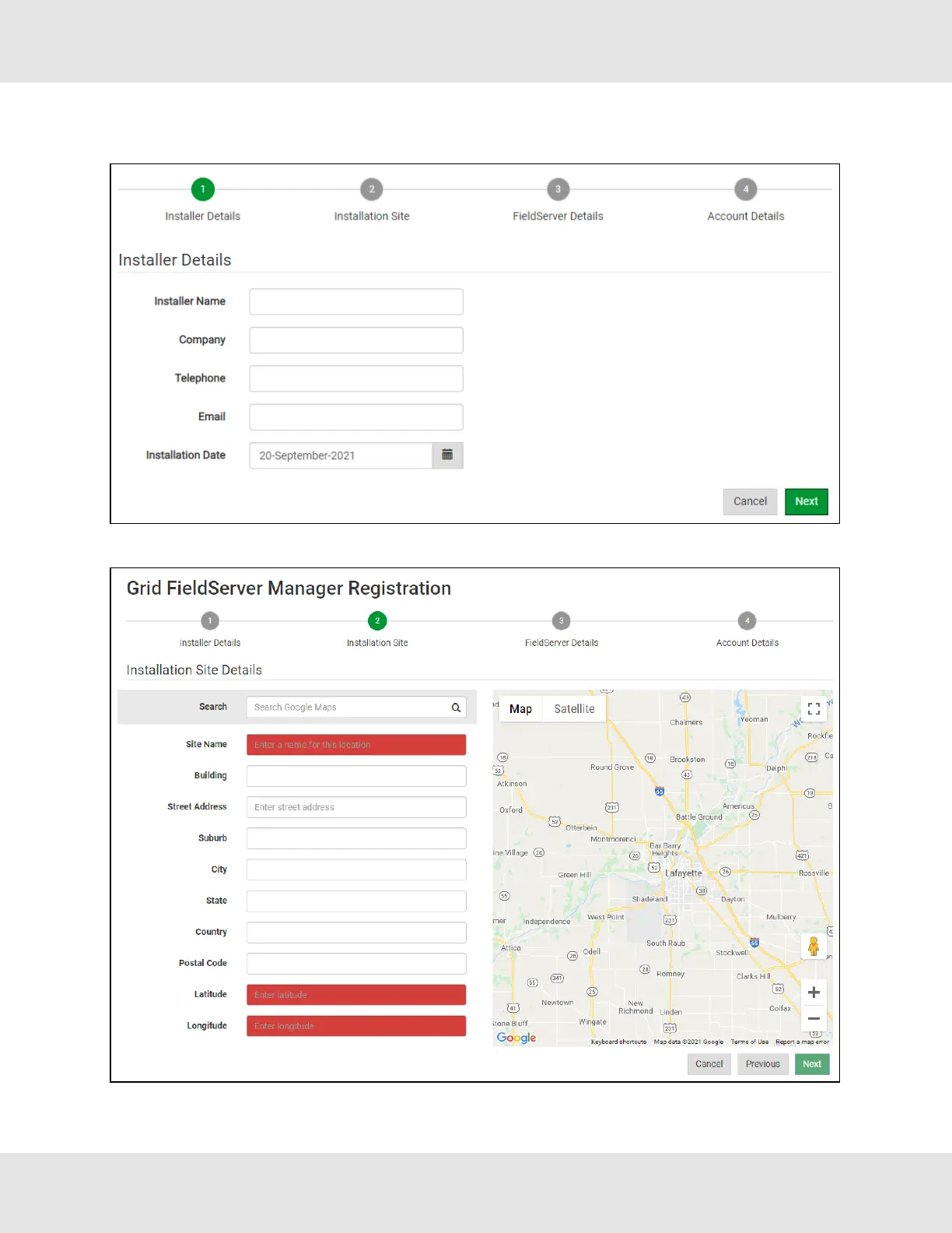 • To register, fill in the user details, site details, gateway details and FieldServer Manager account credentials.
