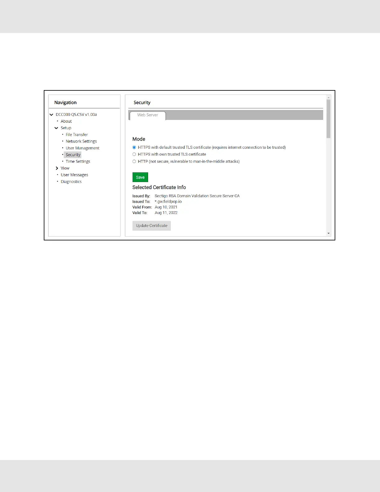 NOTE:A loaded certificate will only be available if the security mode was previously setup as HTTPS with own