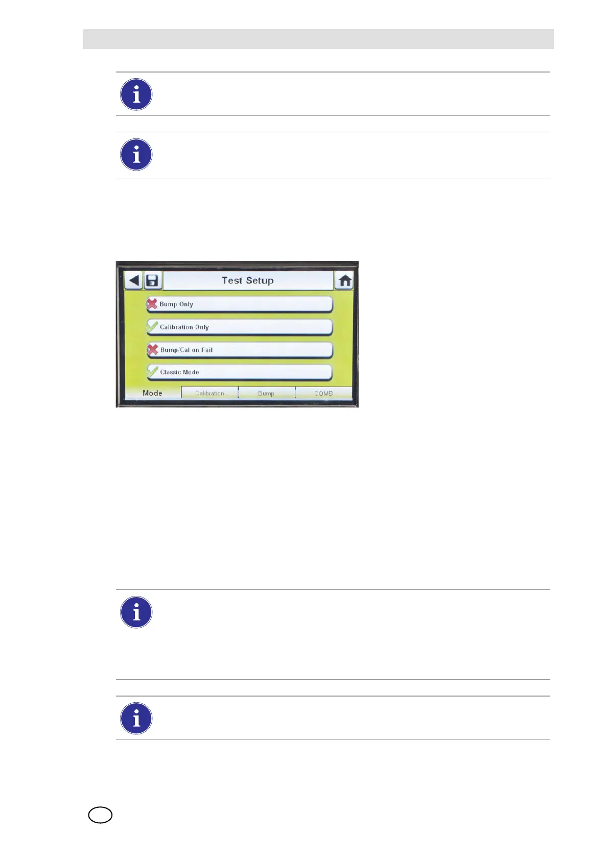 Test Setup screens. There are 4 tabs that can be selected under Test Setup: Mode, Calibration,