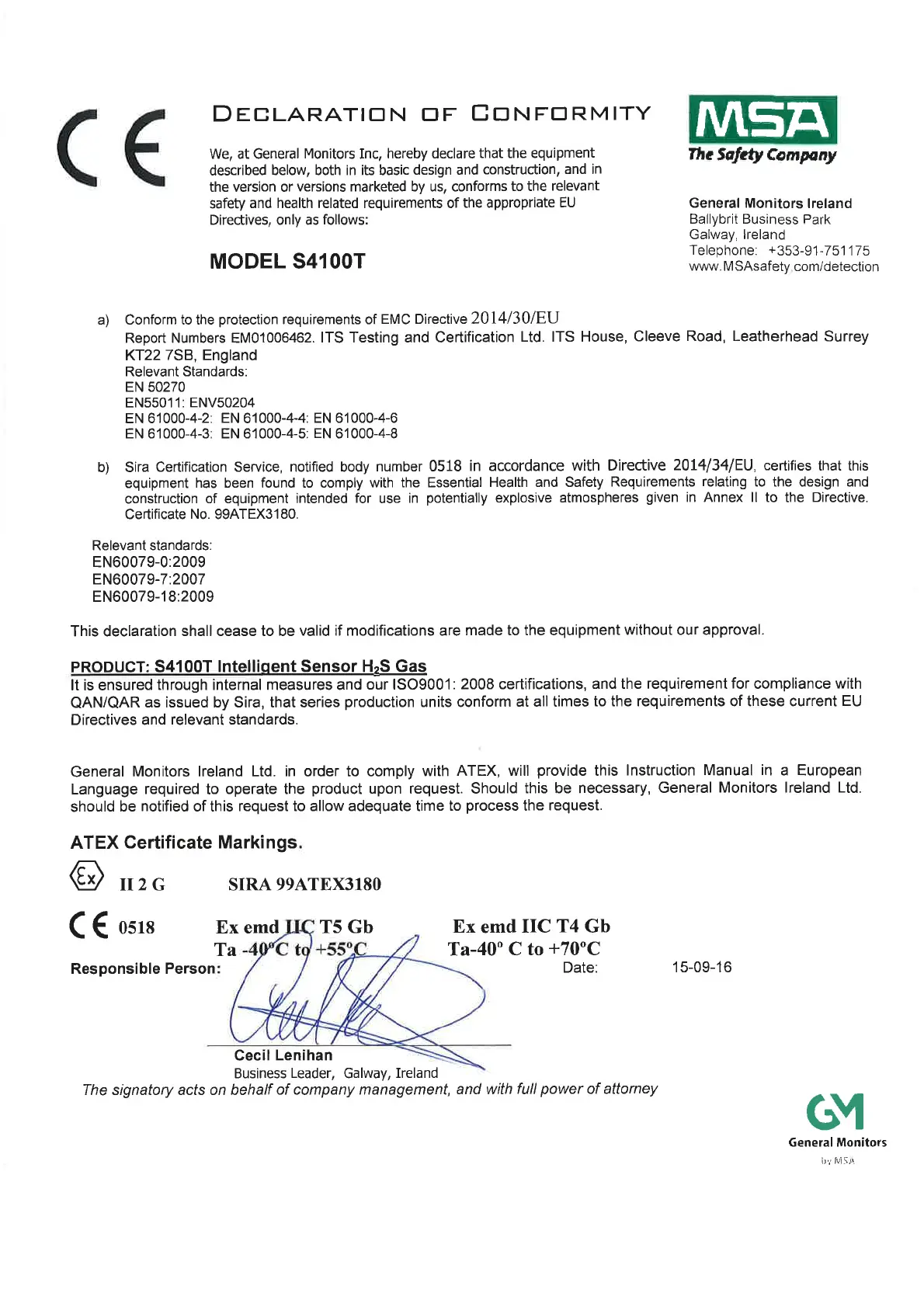 MSA General Monitors S4100C - Declaration of Conformity; EMC Directive Compliance; ATEX Certification