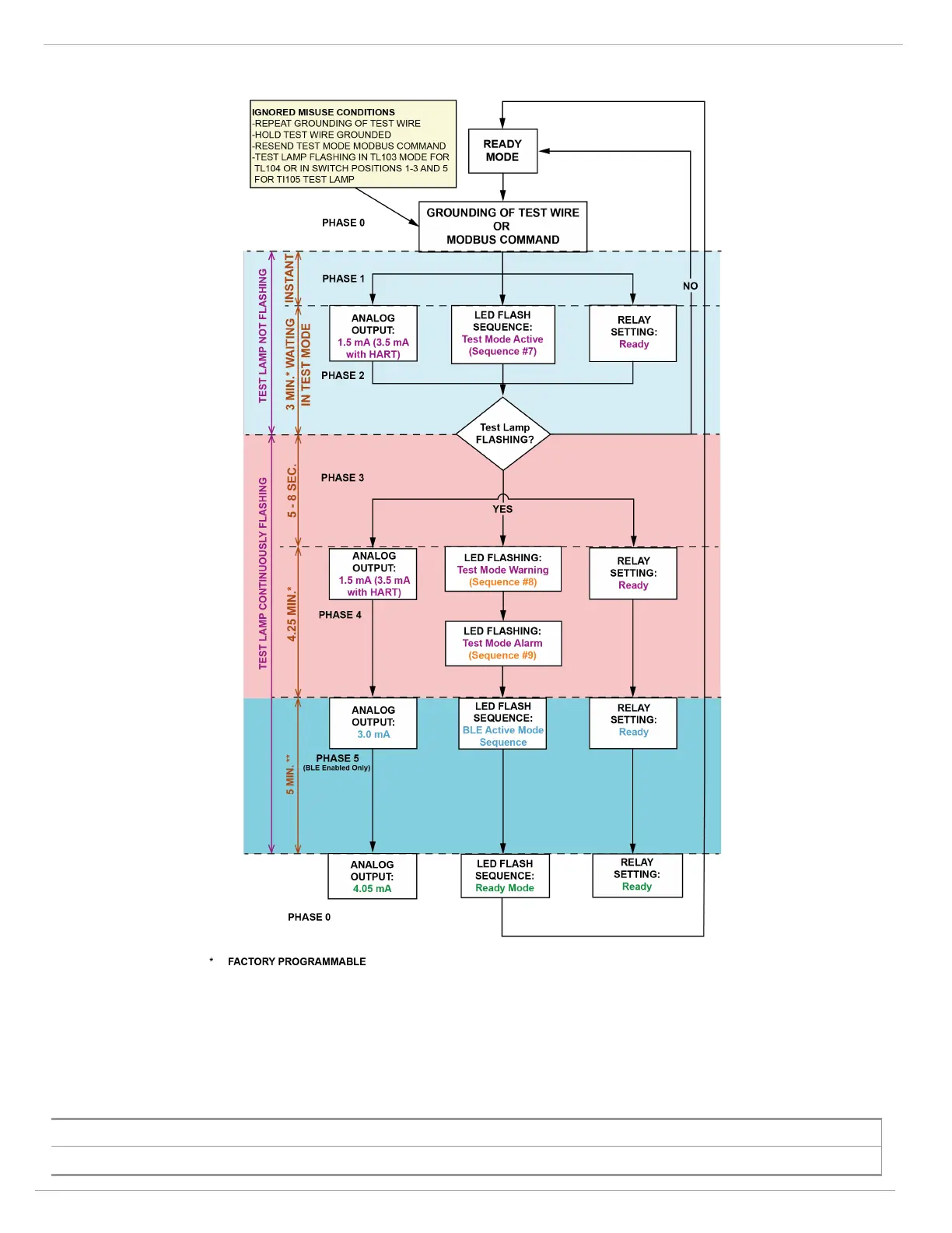 Flashing of the Test Lamp in the Test Mode enabled via test wire or Modbus results in the following sequence of events: