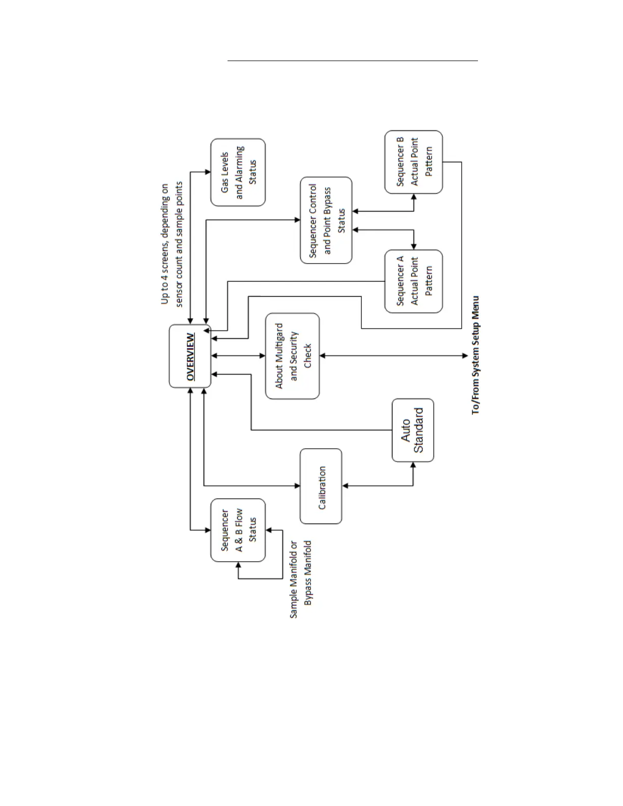 Likewise, the following figure, Dual MultiGard 5000 Screen Hierarchy, Part 1 of 2, summarizes the