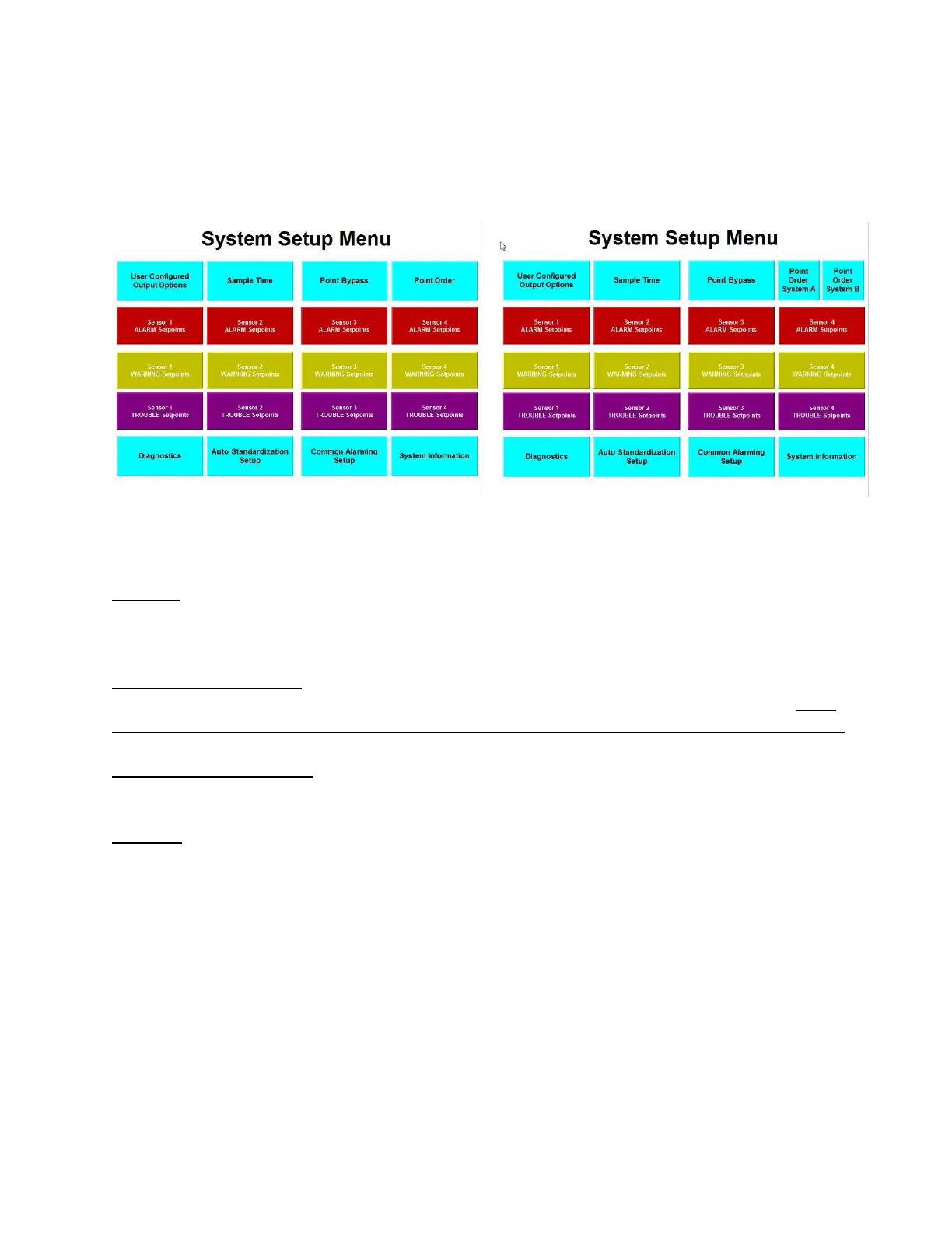 standardization Setup, Common Alarming and System Setup screens, respectively. The " System