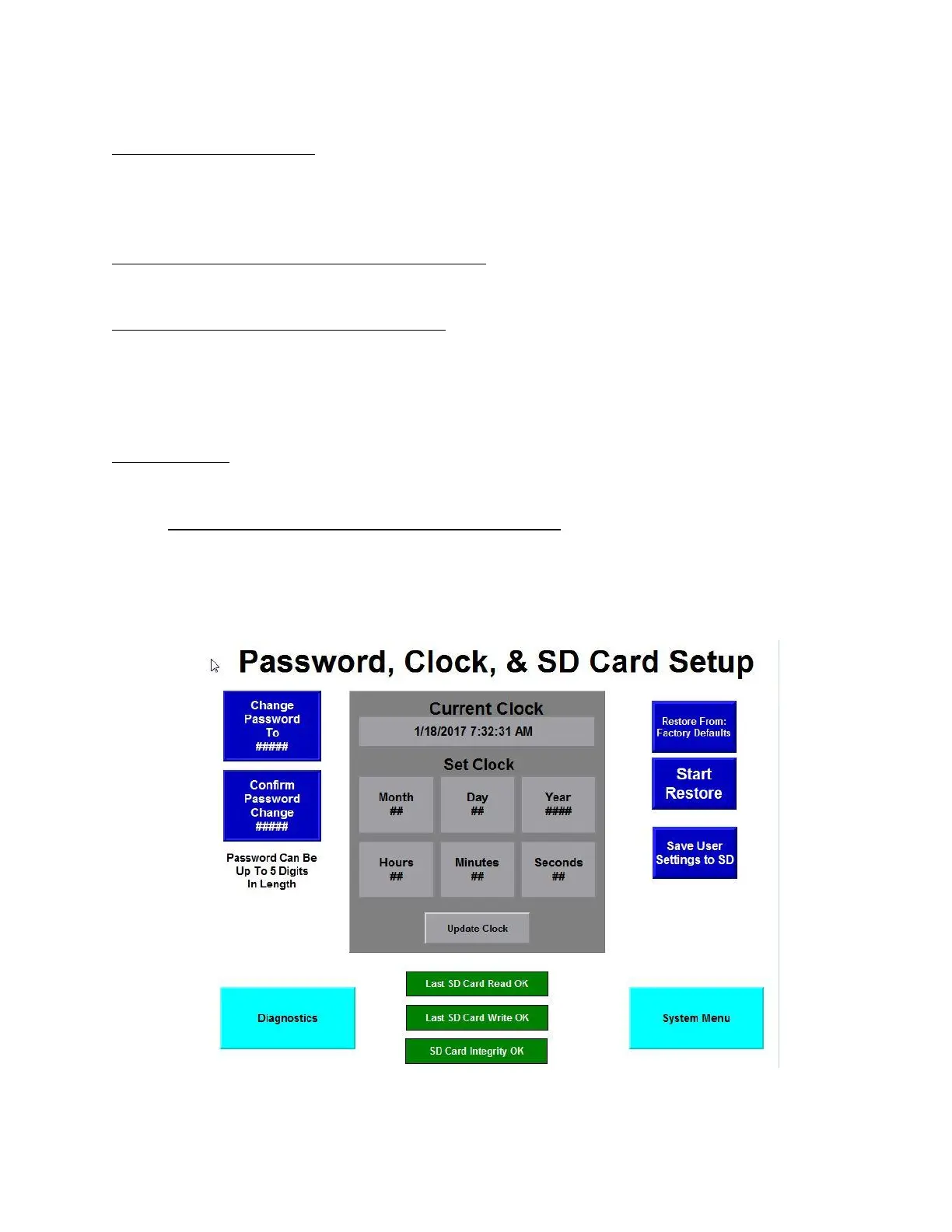 The Password Change, Clock Set and SD Card Setup screen allows the operator to change the