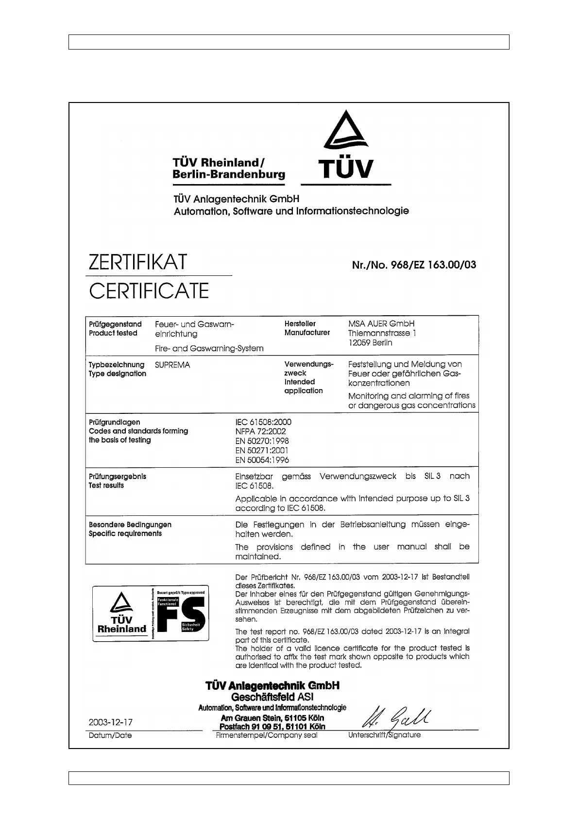 MSA SUPREMA - TUEV-Certificate