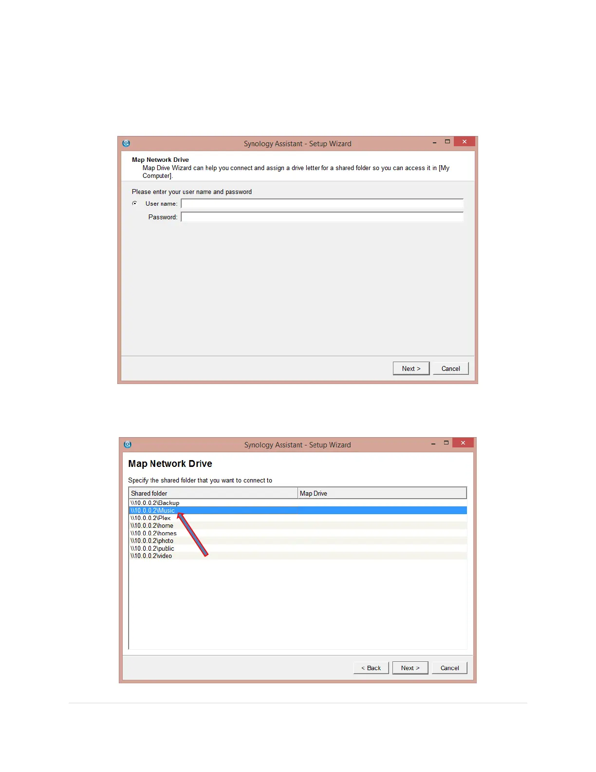 7. A setup wizard will ask for the user name and password to the Synology NAS. After