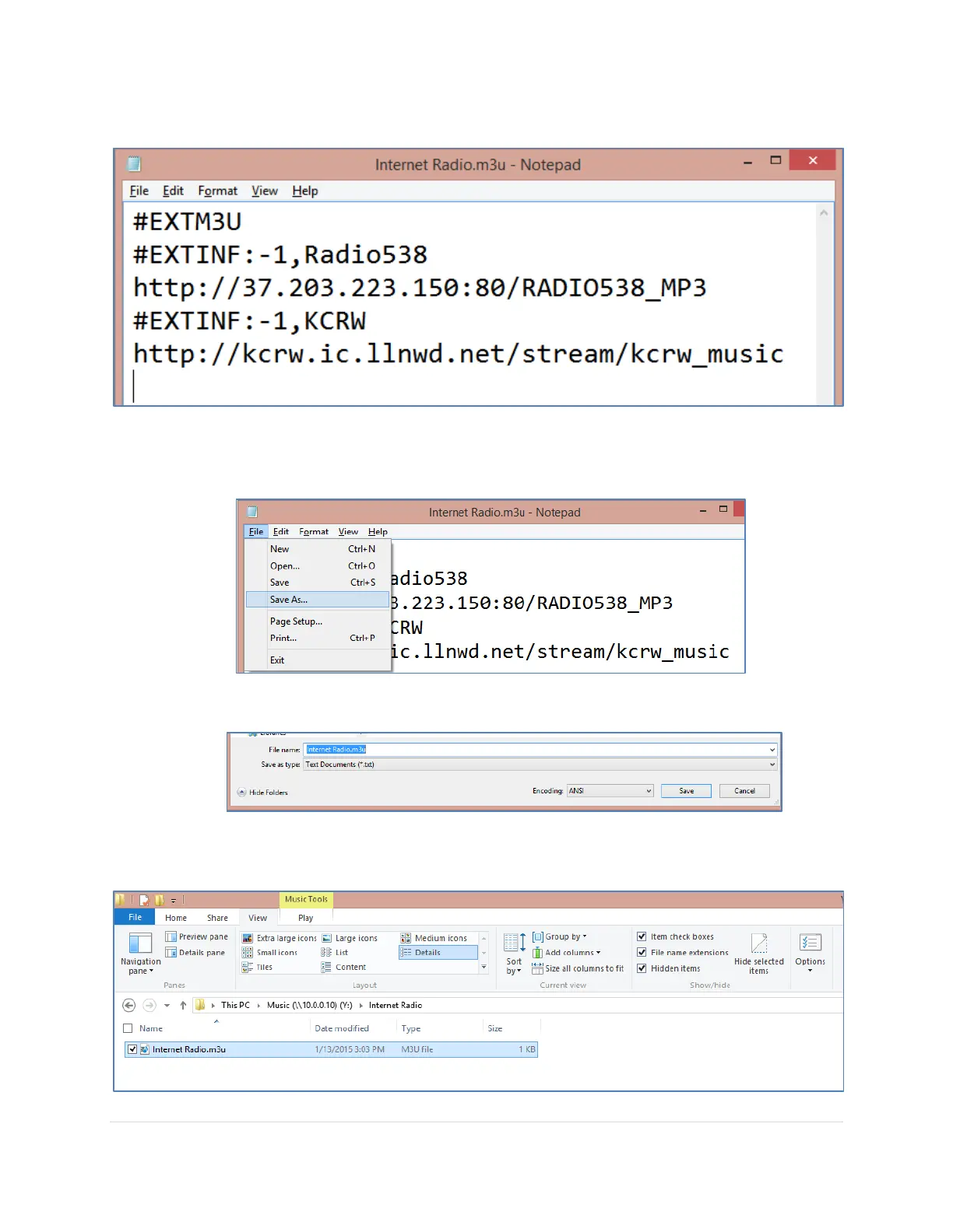 3. Save the notepad file as an .m3u file in your Audio Library folder on the NAS.