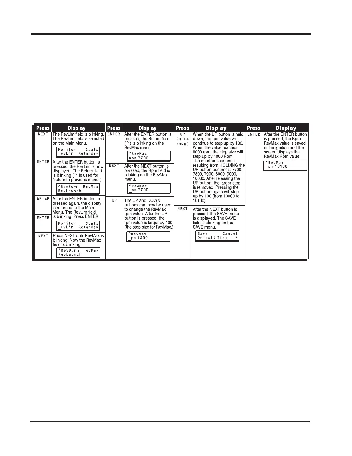 Save will be flashing so press Enter. The screen will go back to the RevMax rpm value to show the