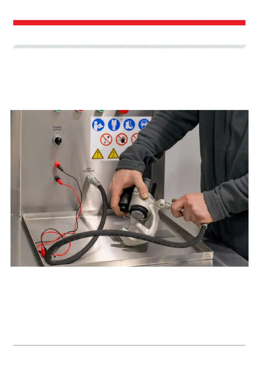 1. Разместите тормознои суппорт над сливным лотком стенда; подсоедините один конец