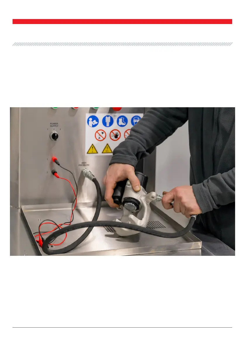1. Place the brake caliper over the test bench drainage container; connect one end of the