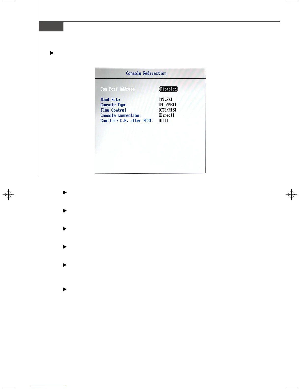 Selecting [On] will enable Console Redirection after OS has loaded.