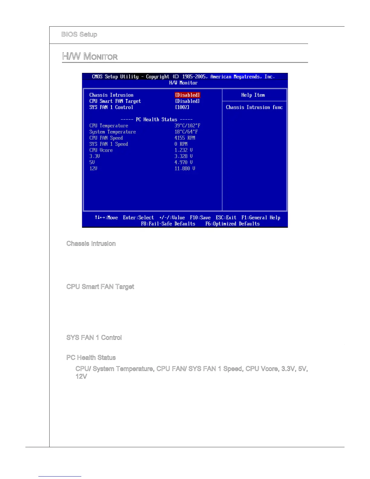 CPU/ System Temperature, CPU FAN/ SYS FAN 1 Speed, CPU Vcore, 3.3V, 5V,