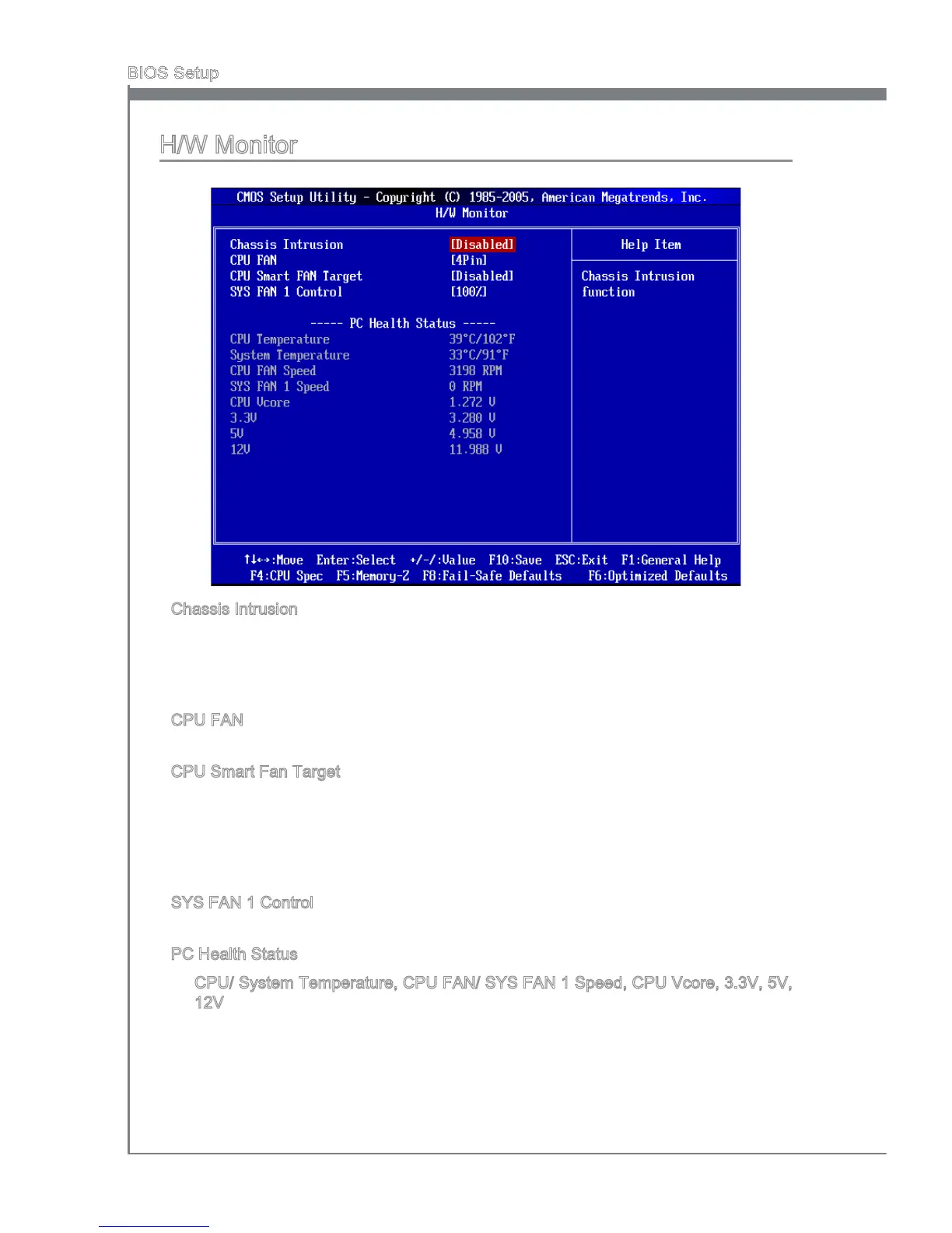 CPU/ System Temperature, CPU FAN/ SYS FAN 1 Speed, CPU Vcore, 3.3V, 5V,