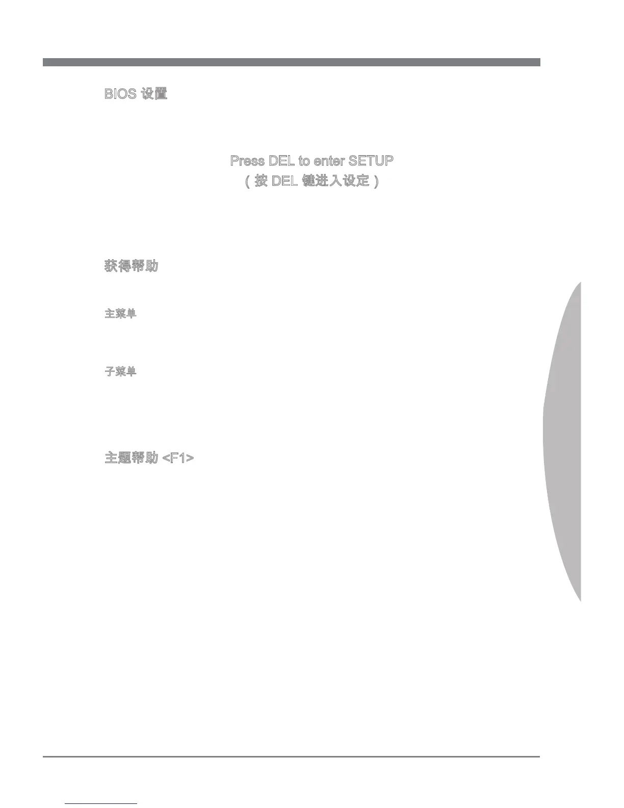BIOS设置菜单提供您主题帮助的屏幕。您可在任一菜单中按<F1>以唤出此幕。此帮助