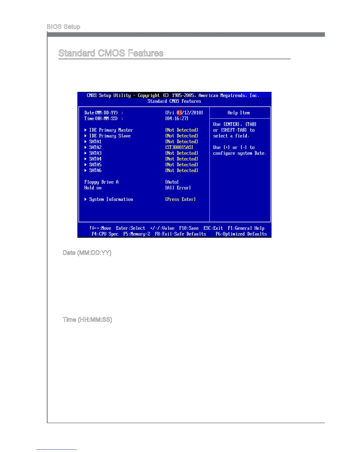 The items in Standard CMOS Features Menu include some basic setup items. Use the