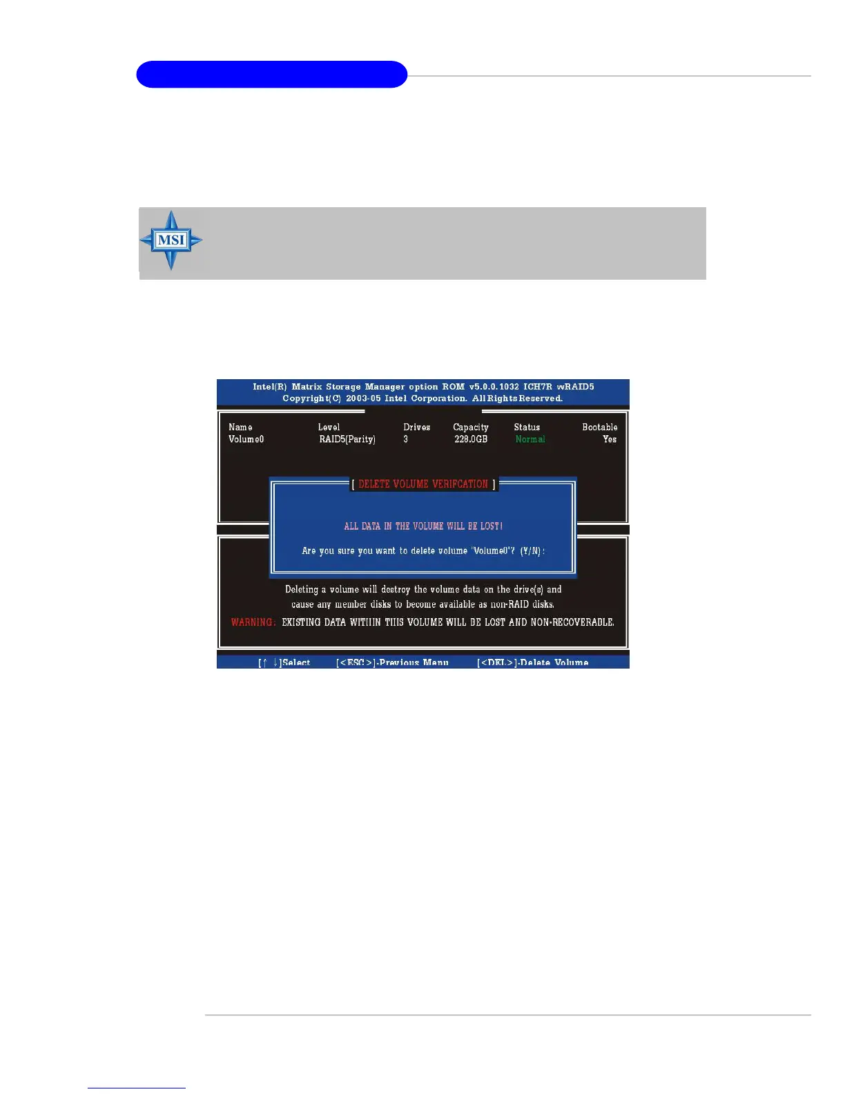 <Enter> key to select a RAID volume for deletion. Then press <Delete> key to delete