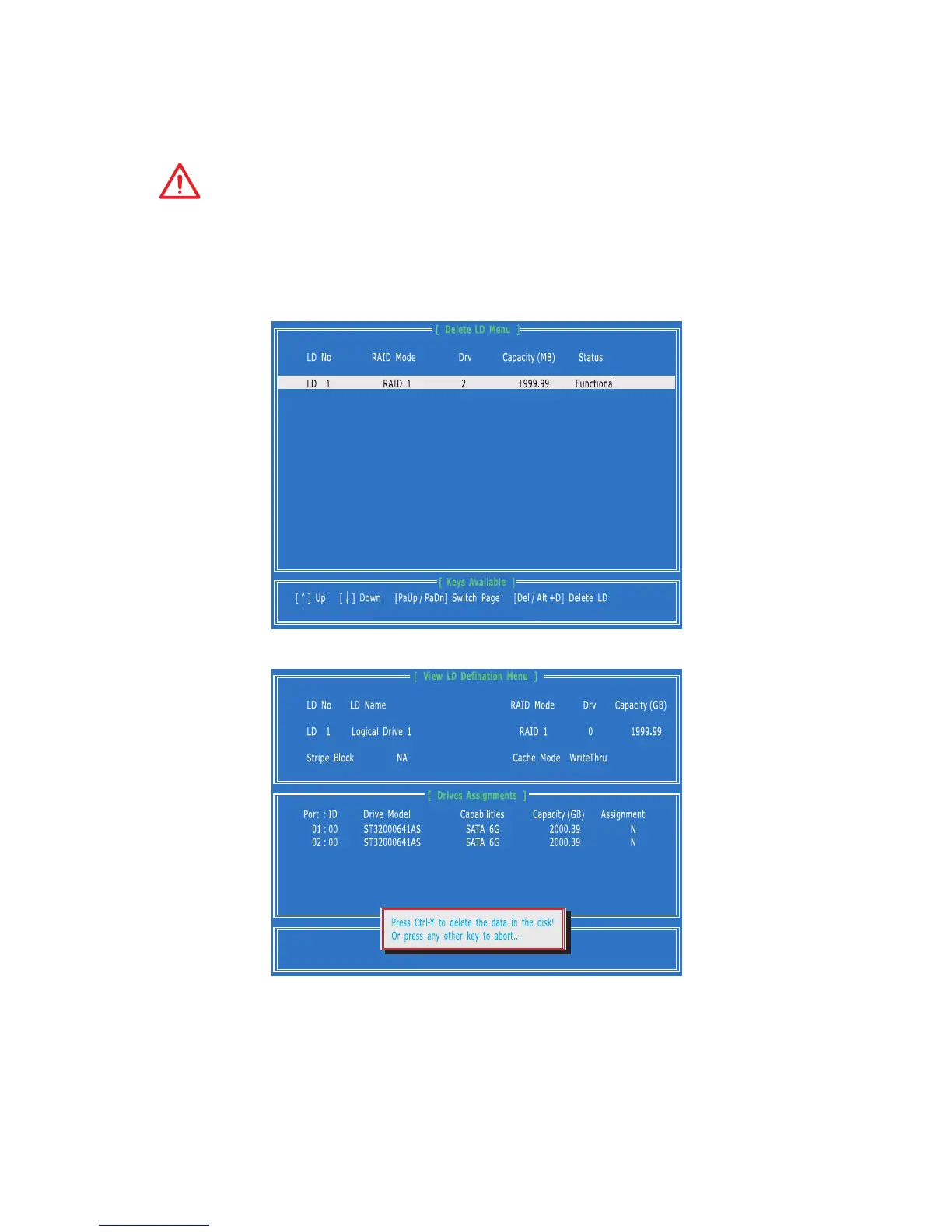 3. A message will display, press Ctrl + Y to delete the RAID volume.
