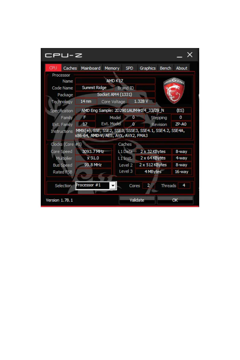 y CPU Tab - shows processor name, code name, package, specification, instructions